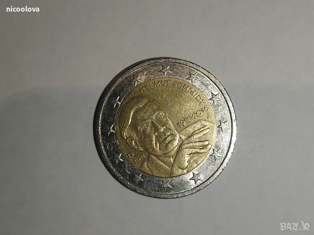 Тази монета е колекционерска възпоменателна емисия от 2 евро от Германия, издадена през 2018 г. в чест на 100-годишнината от рождението на бившия канцлер Хелмут Шмит. Серия J (Хамбург), тираж 6 300 000 . В почти отлично състояние.