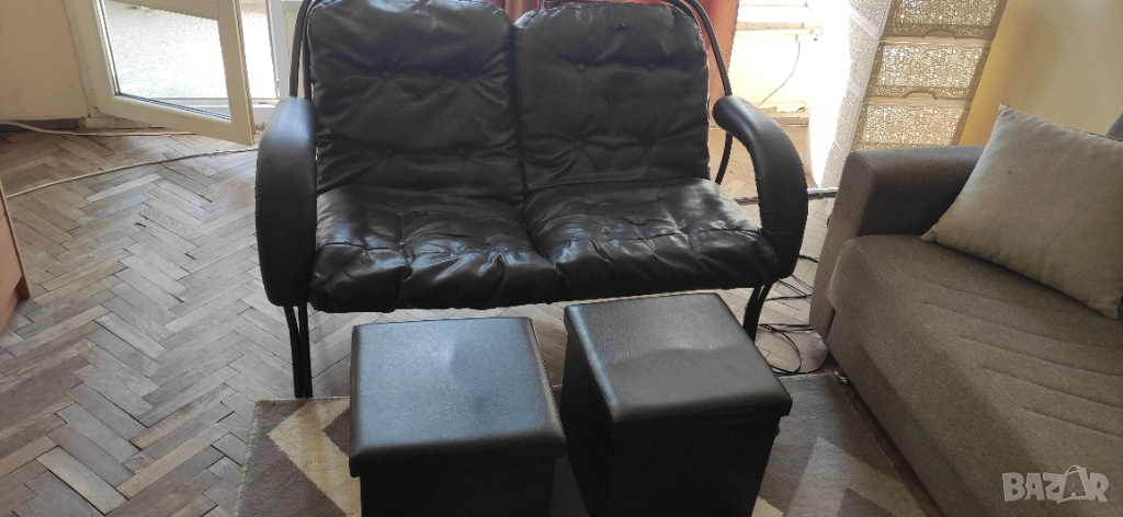 Двоен кожен фотьойл с тръбна конструкция и 2 табуретки → Обява 53794492