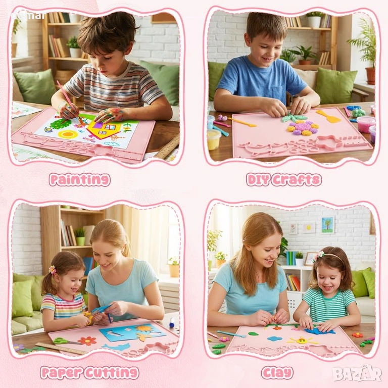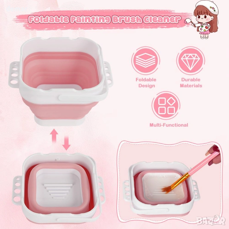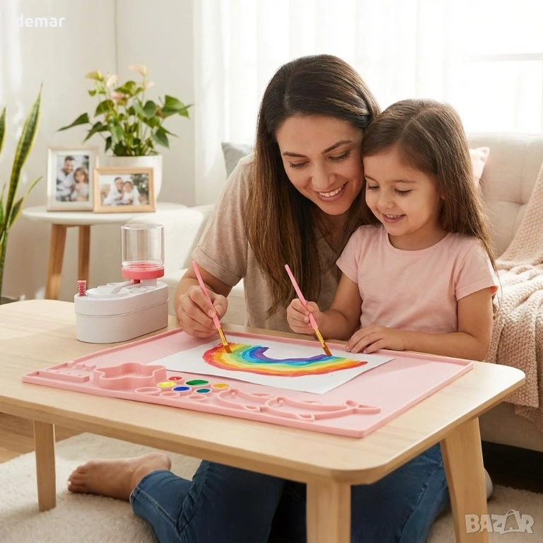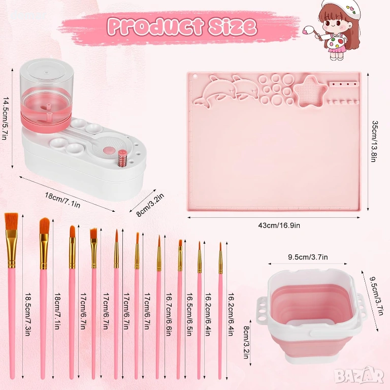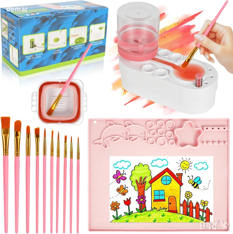 Комплект за рисуване, включващ силиконова подложка за рисуване, инструмент за изплакване на четки, почистване на четки, кофа за измиване и 10 четки за рисуване, предназначени за рисуване с акрилни бои и „Направи си сам“ проекти. Издръжливата силиконова подложка осигурява незалепваща, лесна за почистване повърхност, която предпазва работните зони от разливи и петна, докато инструментът за изплакване на четки и кофата за измиване позволяват ефективно почистване между смяната на цвета, за да поддържат четките в добро състояние. Включеният комплект четки предлага разнообразие от размери и накрайници, подходящи за детайлна работа и обща употреба в занаятите. С компактни размери от 21 × 14 × 11 см, комплектът е пространствено ефективен, лесен за съхранение и подходящ за употреба в домашни ателиета, занаятчийски помещения или хоби работни пространства.
