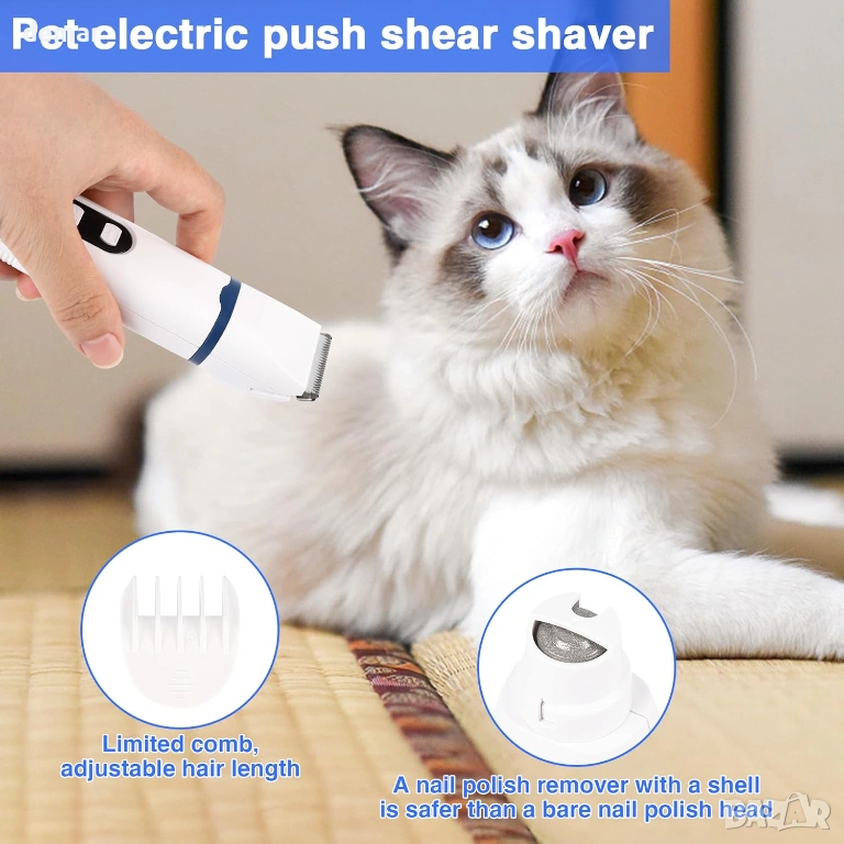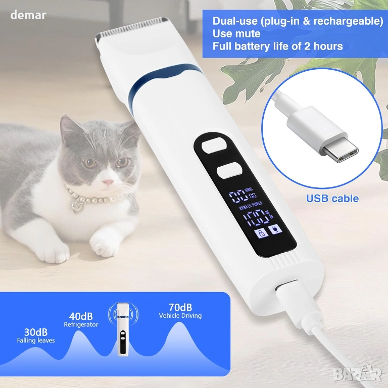 Комплект за подстригване на домашни любимци, проектиран за безопасно и удобно подстригване, с двойна система за заключване от деца, която изисква задържане на двата бутона за три секунди, за да се отключи, предотвратявайки случайно активиране. Тримерът включва две настройки за скорост и интелигентен дисплей, който показва нивото на батерията и състоянието на зареждане в реално време, за да се избегне неочаквана загуба на мощност по време на подстригване. Издръжливите ножчета от неръждаема стомана и керамика осигуряват гладко и ефективно подстригване на гъста, дълга или сплъстена козина, като същевременно остават нежни към кожата на домашния любимец. Комплектът включва четири специализирани приставки за универсално подстригване: заоблен тример за лапи за деликатни възглавнички на лапите, малък нож за уши и лице за чувствителни зони, по-широк грумер за тяло за подстригване на козина и шлифовъчна машина за нокти за грижа за ноктите. Ултратихата му работа помага за намаляване на тревожността при чувствителните към шум домашни любимци, а ергономичният дизайн позволява прецизна и удобна работа.