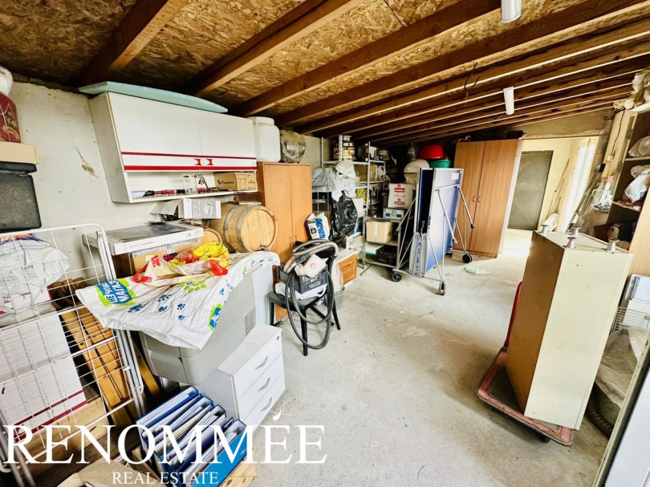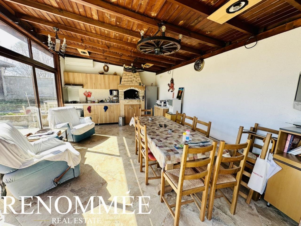 Отделно от тази квадратура към къщата има лятна градина с барбекю на пещ, допълнителни складови постройки, мазе, гараж за три коли.