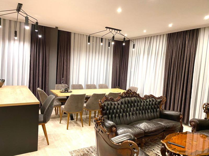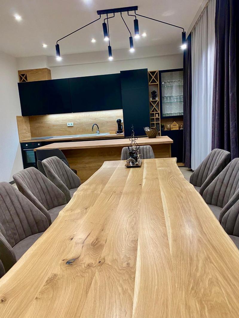 Трапезарията разполага с голяма маса с 10 стола, подходяща за семейни събирания и гости. Апартаментът е напълно завършен, обзаведен и готов за нанасяне веднага.