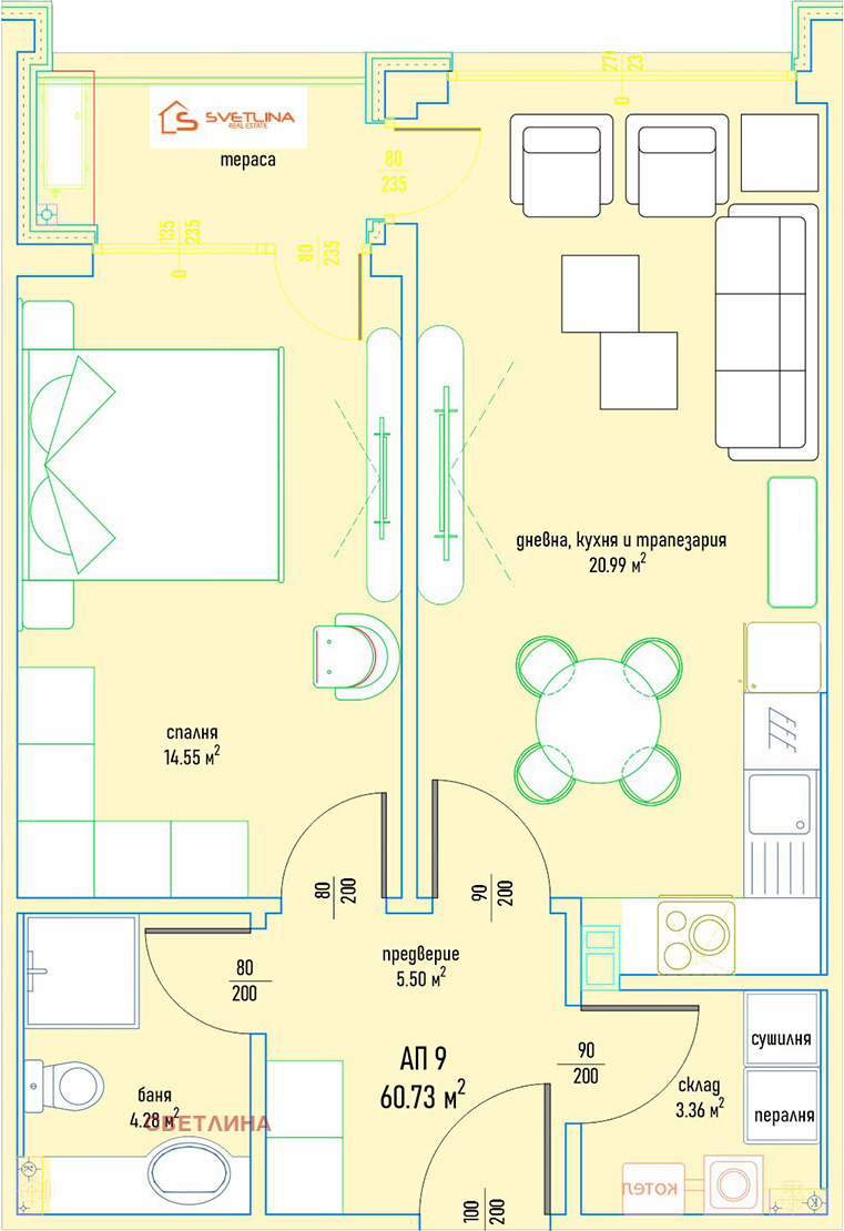 - Разпдеделение: входно антре, дневна с кухненски бокс, спалня, баня с тоалетна, мокро помещение и тераса