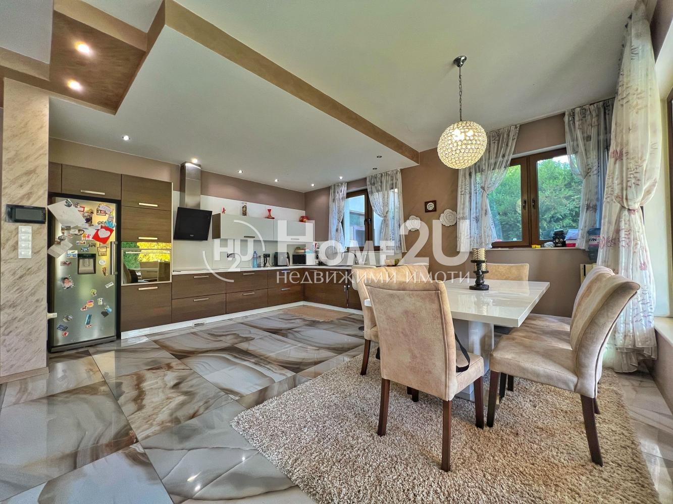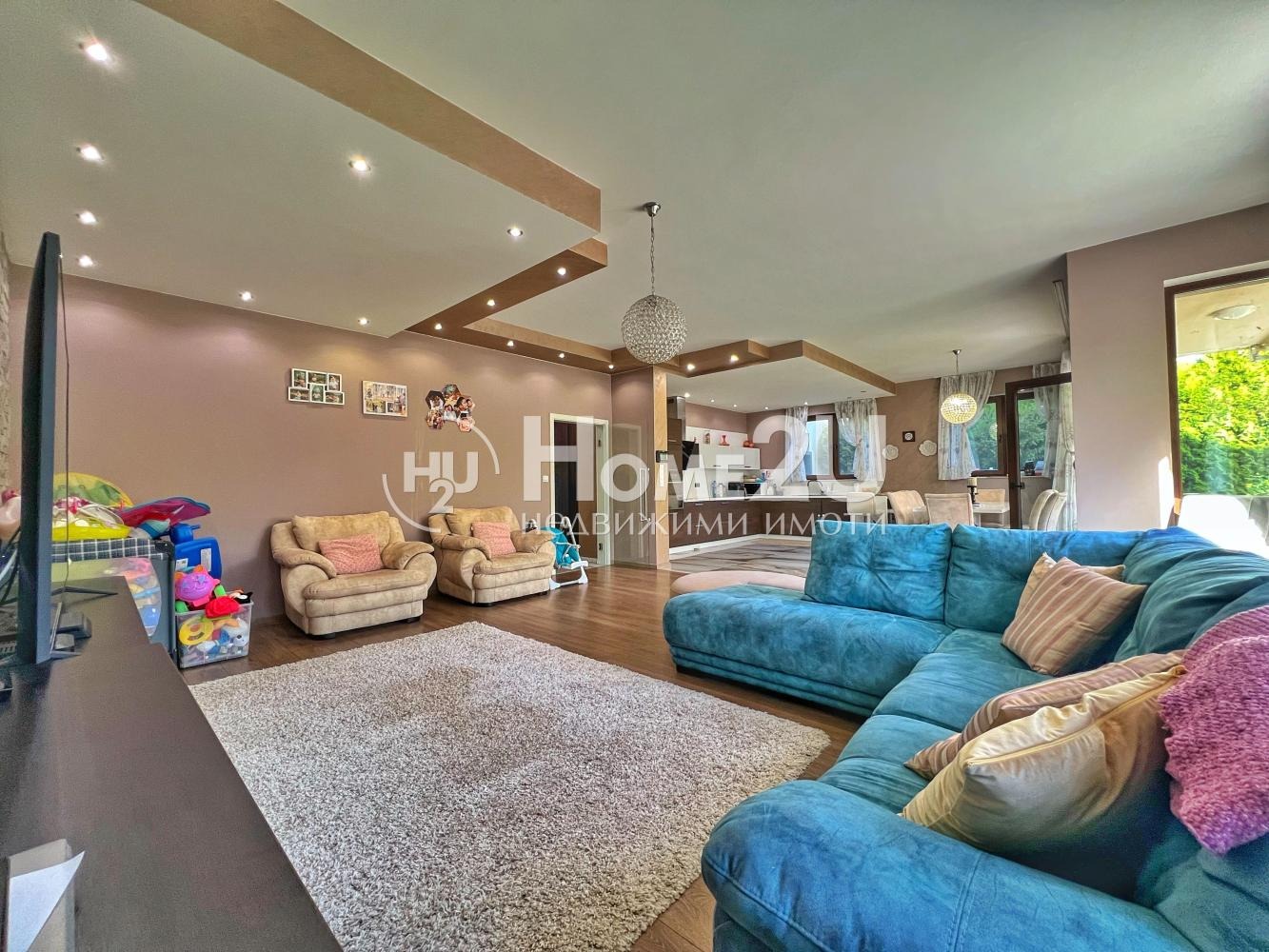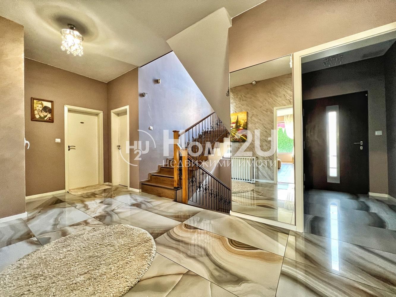 Имотът е с разгърната площ 420 кв.м, изпълнен с простор и функционалност. Дневната зона впечатлява с мащаб голяма всекидневна, комфортен кът за релакс, трапезарна част и отлично разпределена кухня, осветена от естествена светлина.