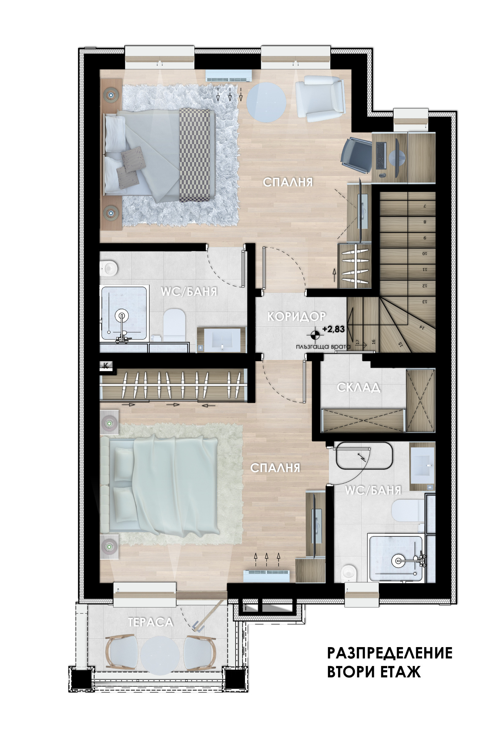 2-ри етаж: Вариант 1 - две спални, всяка по 18 кв.м, две бани и един склад, тераса; Вариант 2 - три спални с една баня, тераса. Възможност за обединяване на съседни имоти.