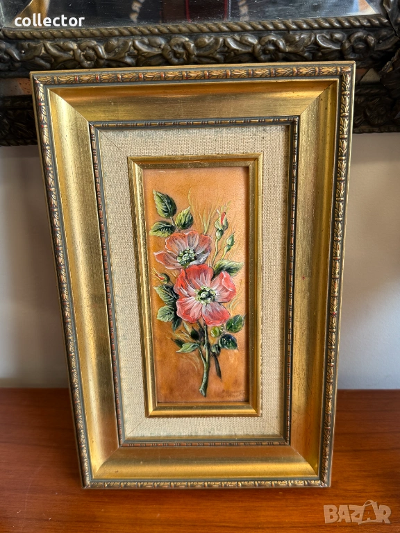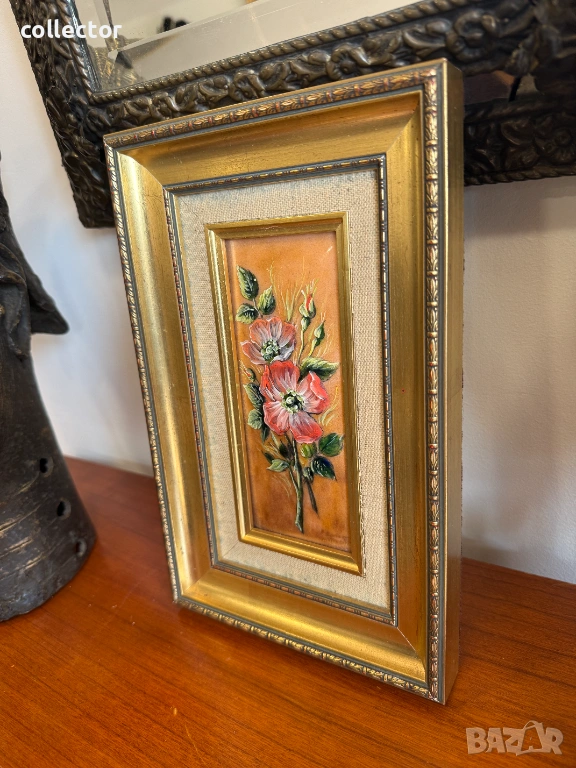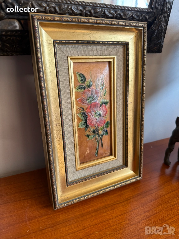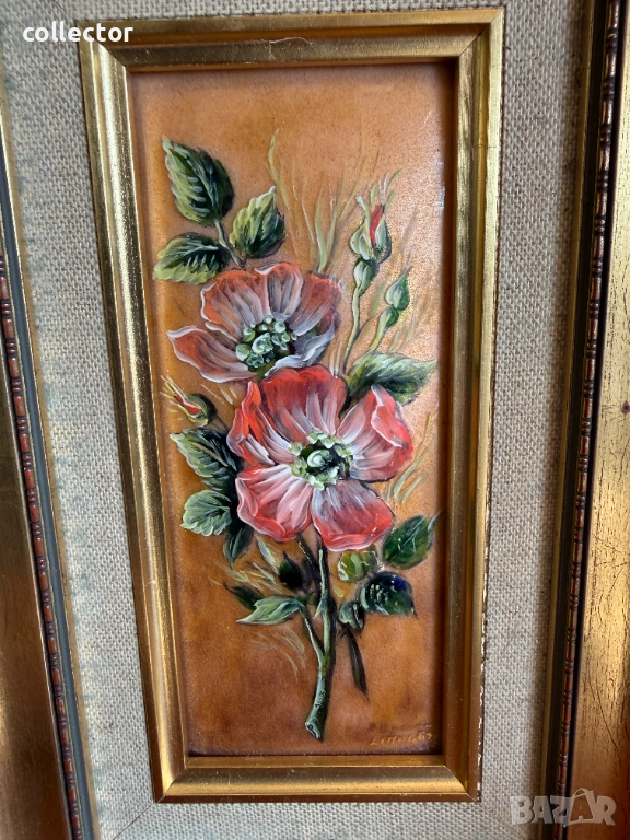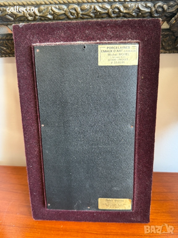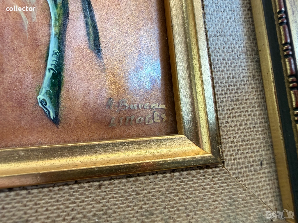 Очарователна картина, изобразяваща букет цветя с лиможки емайл. Изработена е върху извита медна плоча и е подписана долу вдясно André Bureau. Продава се в оригиналната си златна рамка.