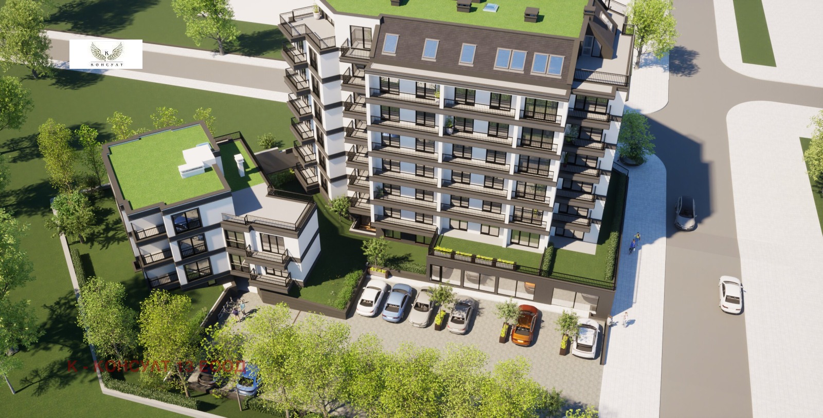 Сградата впечатлява с архитектурен облик, изящни форми, оптимална функционалност при разпределение на пространствата и озеленени тераси.
