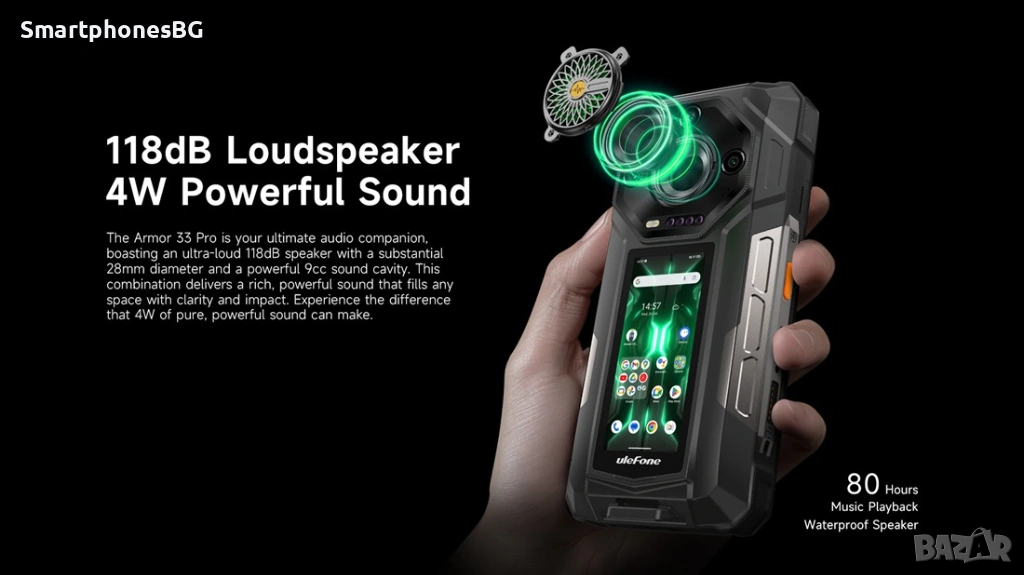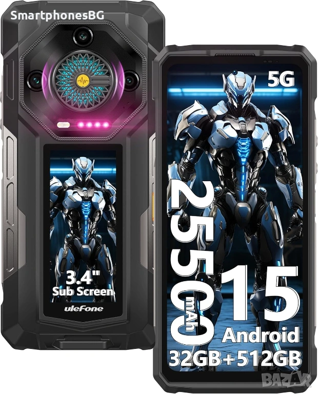 Ulefone Armor 33 Pro 5G предлага висока производителност с 32GB RAM, 512GB вградена памет и голяма 25500mAh батерия. Със защита по стандарт IP68, устройството е подходящо за екстремни условия.