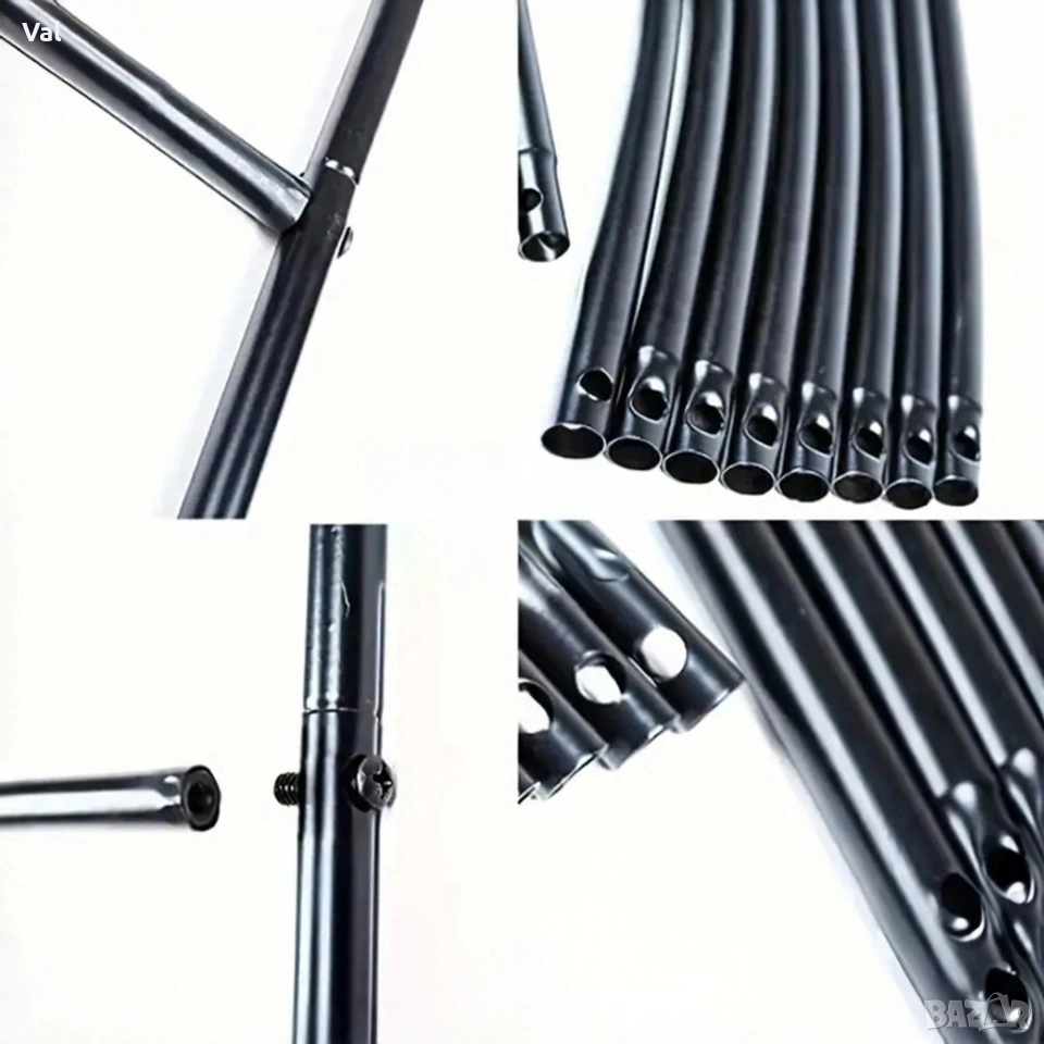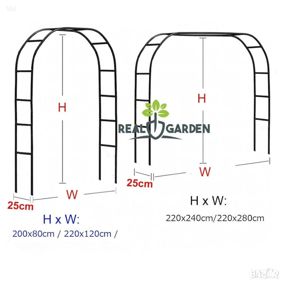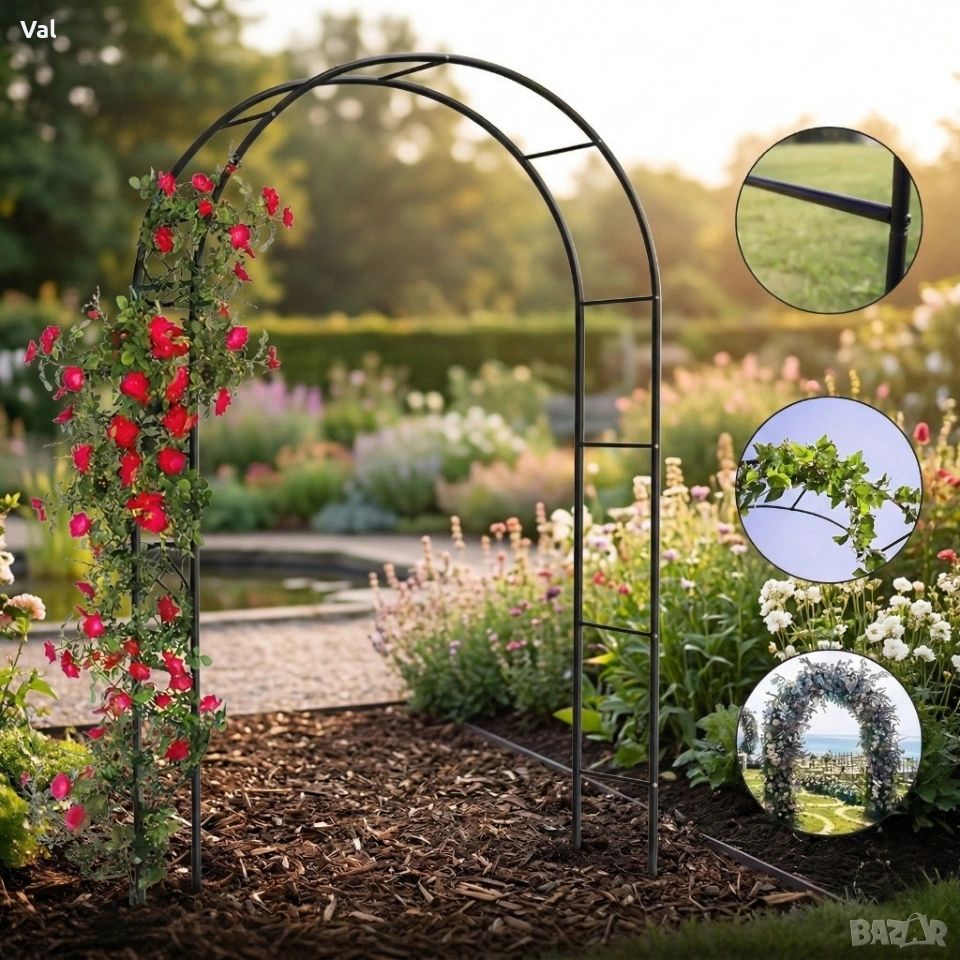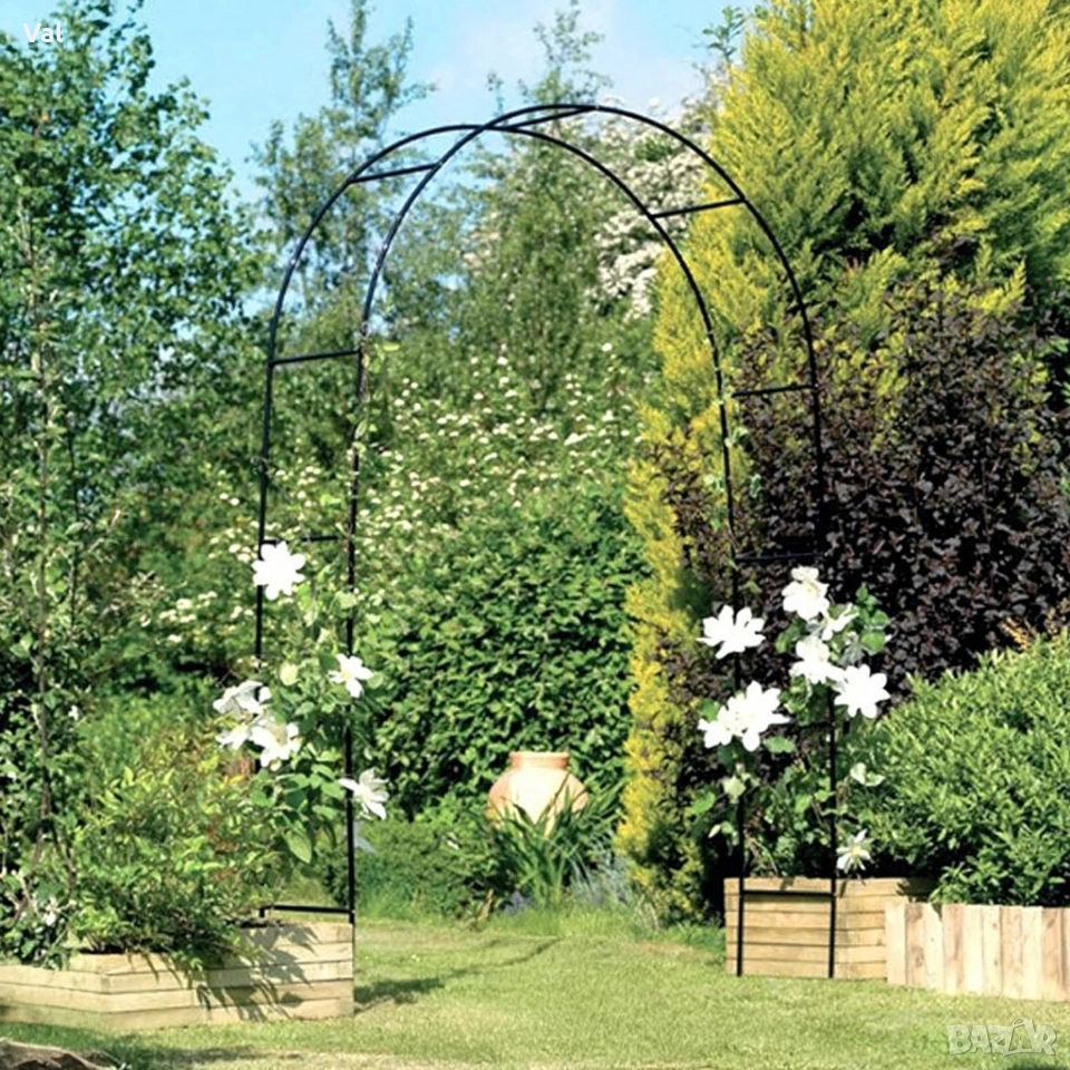 Височина: до 2200 мм Ширина: до 2400 мм Дълбочина: 250 мм Материал: прахово боядисана стомана, устойчива на атмосферни условия Тегло: приблизително 2 кг (лесна за преместване и монтаж) Тип продукт: градинска арка/пергола, подходяща за външна употреба