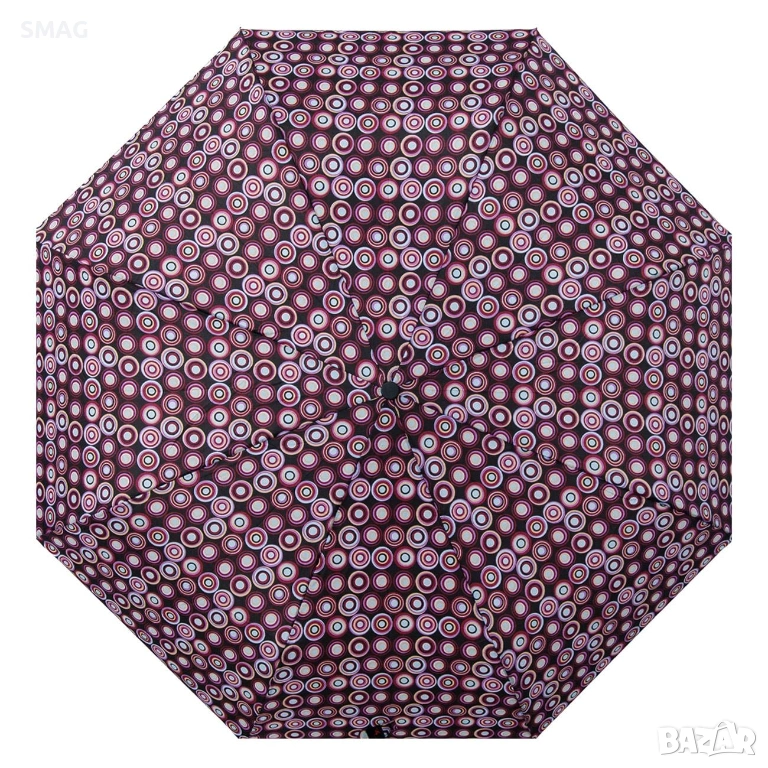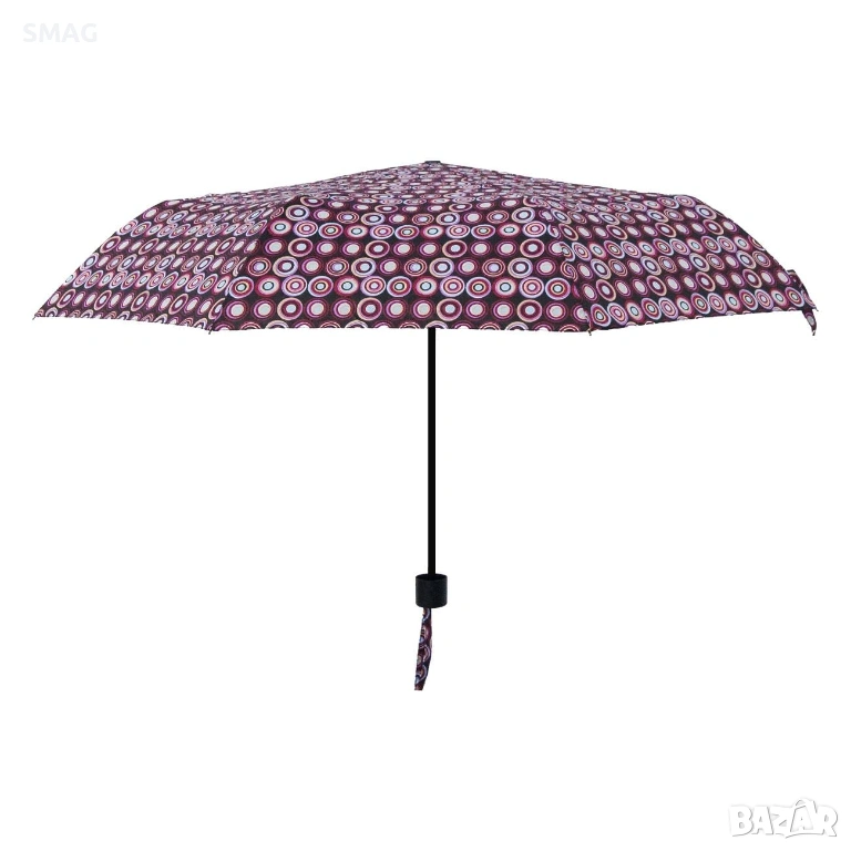 Компактен сгъваем чадър за дъжд в черен цвят с дизайн от лилави и светлолилави кръгове. Разполага с ръчен механизъм за отваряне и удобна пластмасова дръжка с връвчица за китката. Практичен аксесоар за ежедневна употреба, който се побира лесно в чанта или раница.