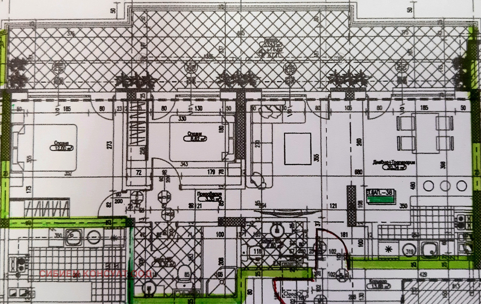 Апартаментът е със ЗП 74кв.м./обща площ 96кв.м., състои се от коридор, просторна дневна с трапезария и к. бокс, 2 спални, 2 бани с тоалетна и чудесна тераса с излаз от всички помещения (тип 'зимна градина') с площ от 34 кв.м.
