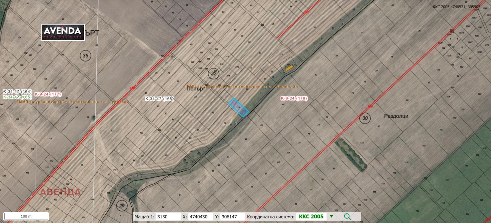 Парцелът е с 45 метра лице към полски път, правилна форма и удобен достъп. Съседният парцел ПИ 58606.32.71 с площ от 500 кв.м, също се предлага за продажба.