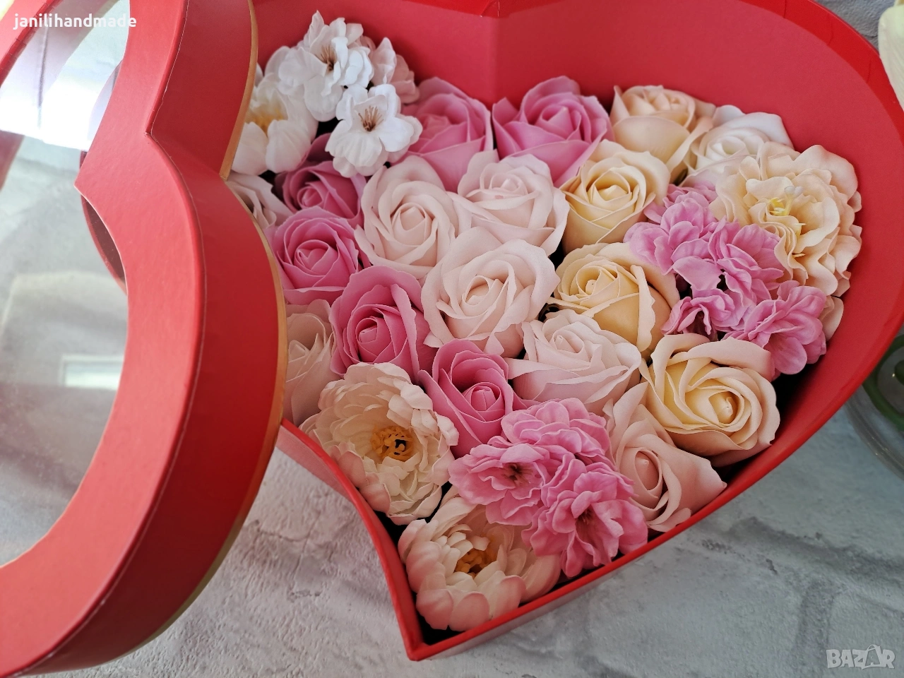 Луксозна кутия сърце, декорирана с цветя от пластичен
