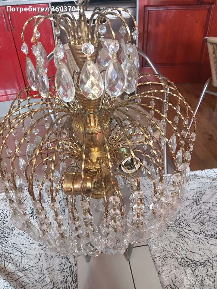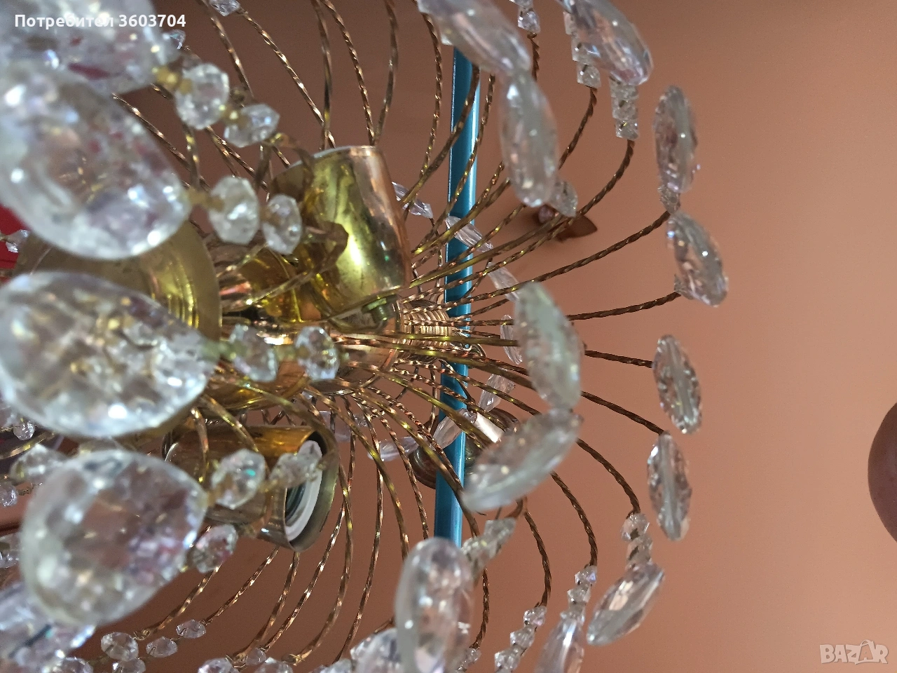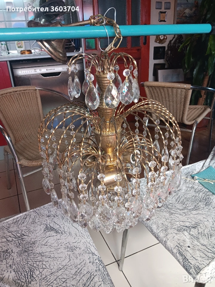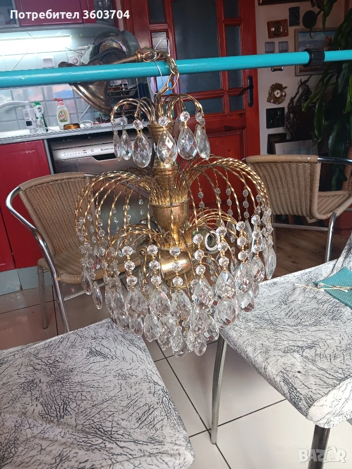 кристален полилей Франция изработен от позлатен месинг множество Кристали и три крушки от 50-те години на 19 век от липсва нито един Кристал всичко се е на мястото в отлично състояние високи 70 см и е широк 37 см уникален предмет за вашия хубав дом такъв Не можеш да намериш в днешните магазини камо ли и на такава цена Благодаря ви за вниманието Разгледайте и другите мои обяви може нещо друго да харесате