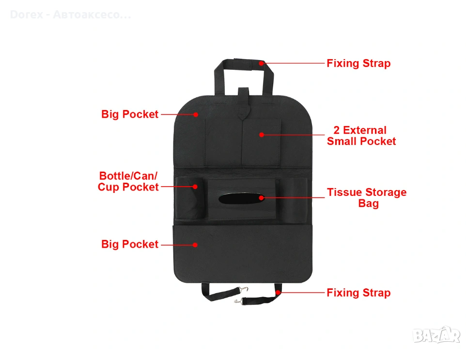 Органайзерът разполага с 6 удобни джоба, които позволяват подредено съхранение на напитки, салфетки, аксесоари и други дребни предмети, необходими по време на път. Двата специални джоба за напитки осигуряват стабилно място за бутилки или кенчета, а големият джоб с допълнителни отделения е подходящ за различни аксесоари.