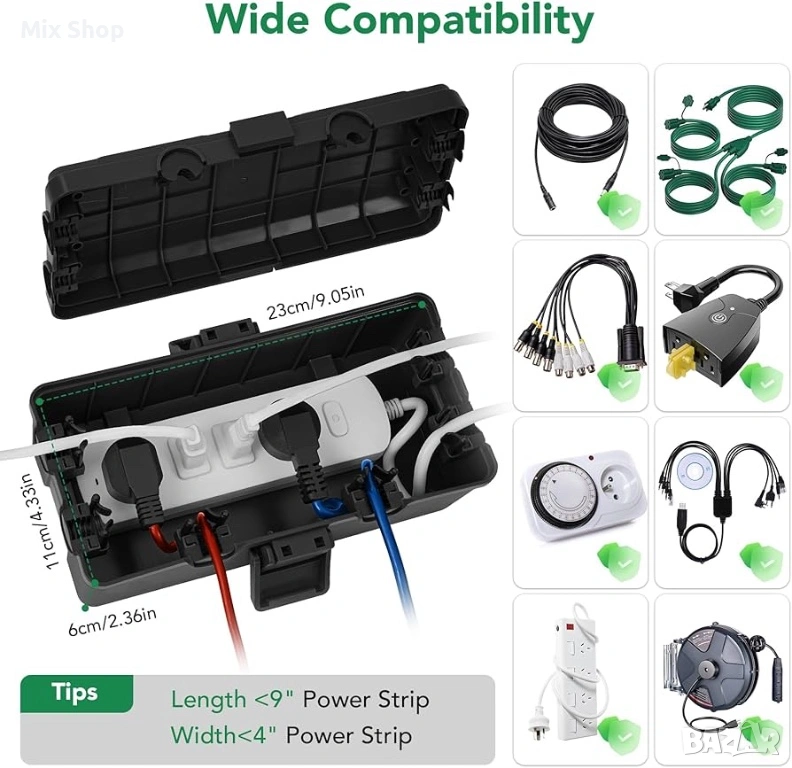 РАЗМЕРИ: Вътрешен размер 10,4x6x4,2 инча. Подходящ за защита на вашия външен разклонител (дължина <9 инча), контакт за таймер, щепсел, удължителен кабел и голям адаптер. Разполага с широк канал за множество кабели и шнурове, с нископрофилен дизайн, който се слива безпроблемно със сцената.
