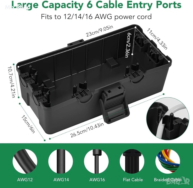 ШИРОКА СЪВМЕСТИМОСТ: Кутията за удължителни кабели е оборудвана с 6 кабелни порта, идеални за уплътняване на кабели с размер 12/14/16/18, плетени кабели и плоски проводници. Всеки порт е облицован с гумено уплътнение, за да не прониква вода. Простият дизайн със закопчаване позволява бърза настройка без нужда от инструменти или специално оборудване.