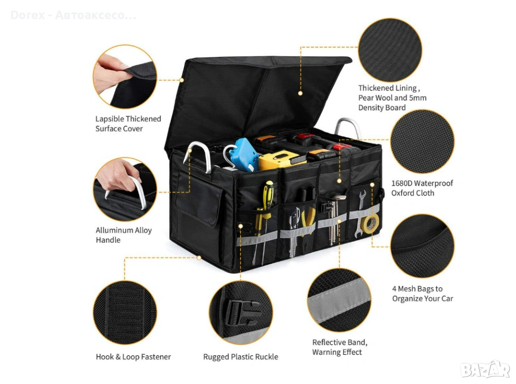 Органайзерът разполага с множество вътрешни и външни отделения, които позволяват удобно съхранение и подреждане на различни предмети – инструменти, хранителни продукти, автомобилни аксесоари, къмпинг оборудване или покупки. Подсилените стени и капак осигуряват стабилност и защита на съдържанието.