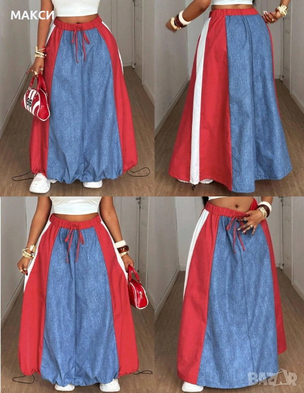 Макси модерна ефирна клоширана дълга пола с ластична талия+ коригиращи вързалки в атрактивни контрастни цветове+ деним ефект