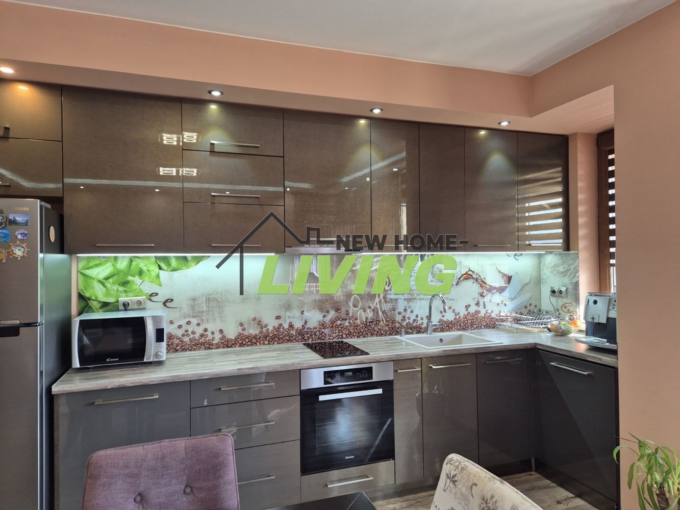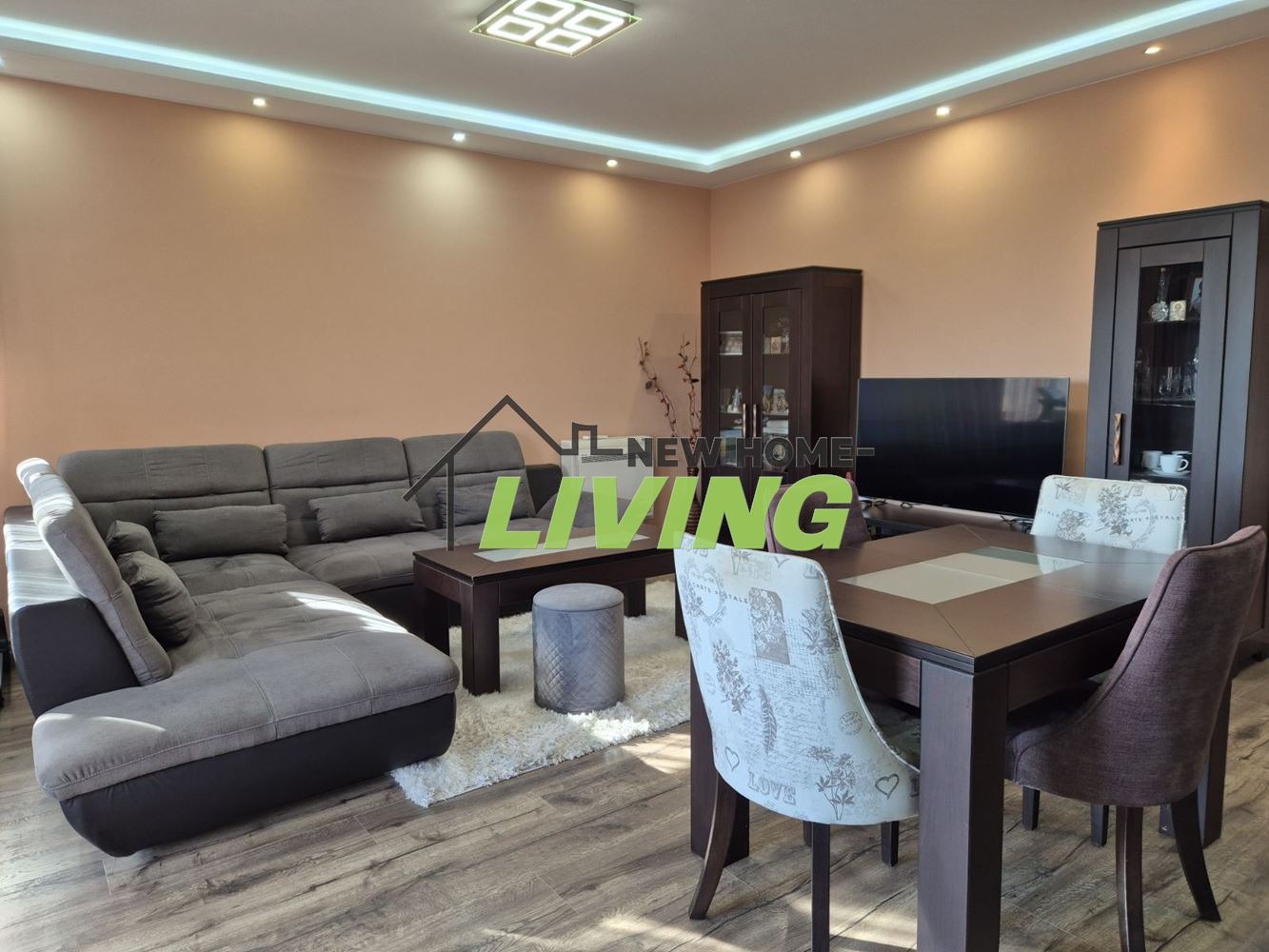 Разпределение: просторен слънчев хол с кухненска и трапезарна част, две самостоятелни спални, баня с тоалетна и втора тоалетна, обособена като перално помещение.