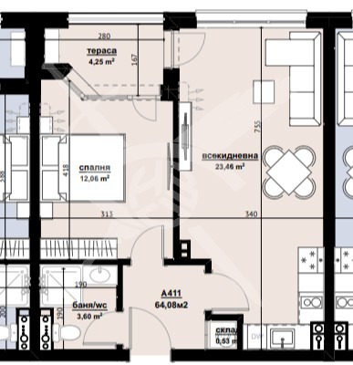 РАЗПРЕДЕЛЕНИЕ: Жилището разполага с площ 64,08 кв.м., състои се от хол с кухня, спалня и баня с тоалетна.