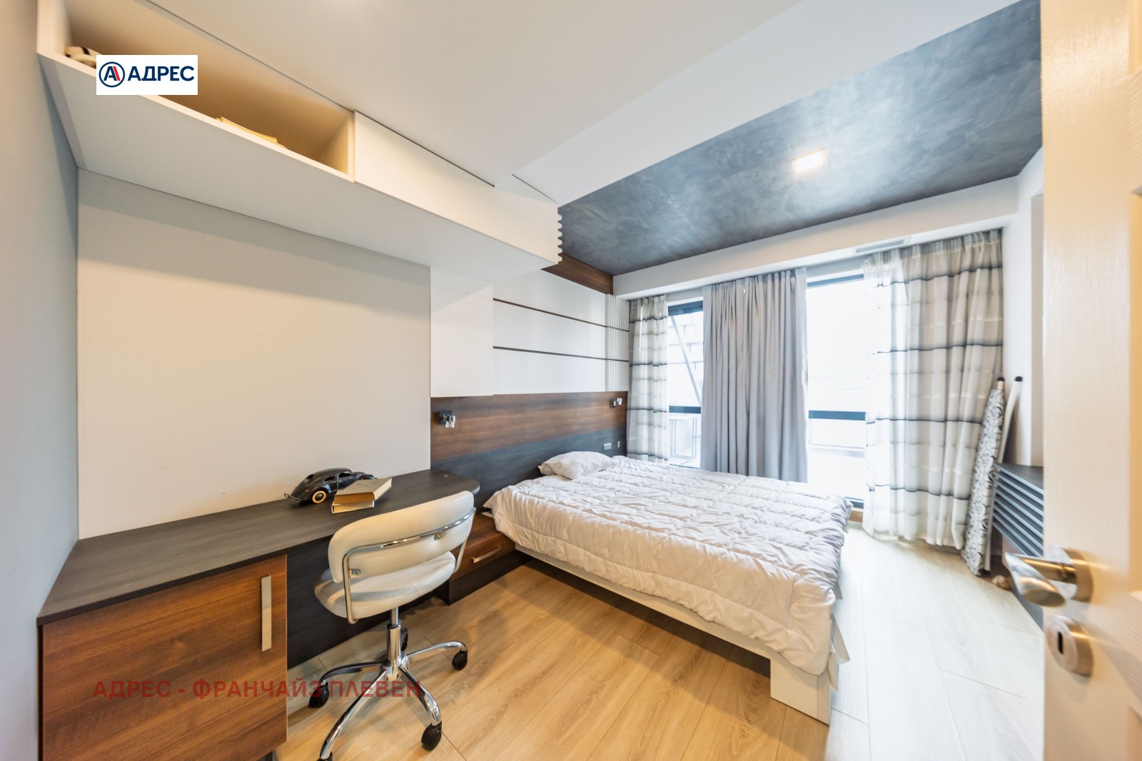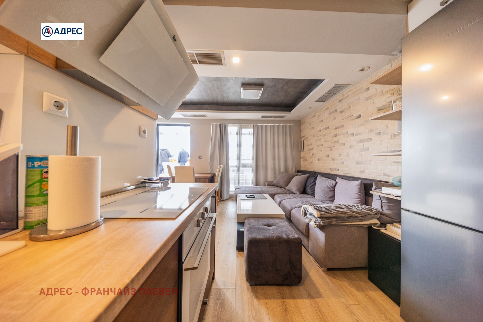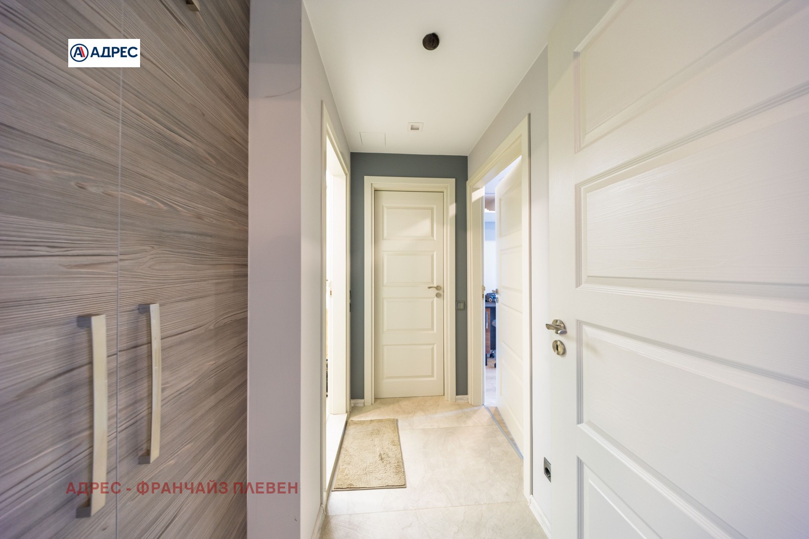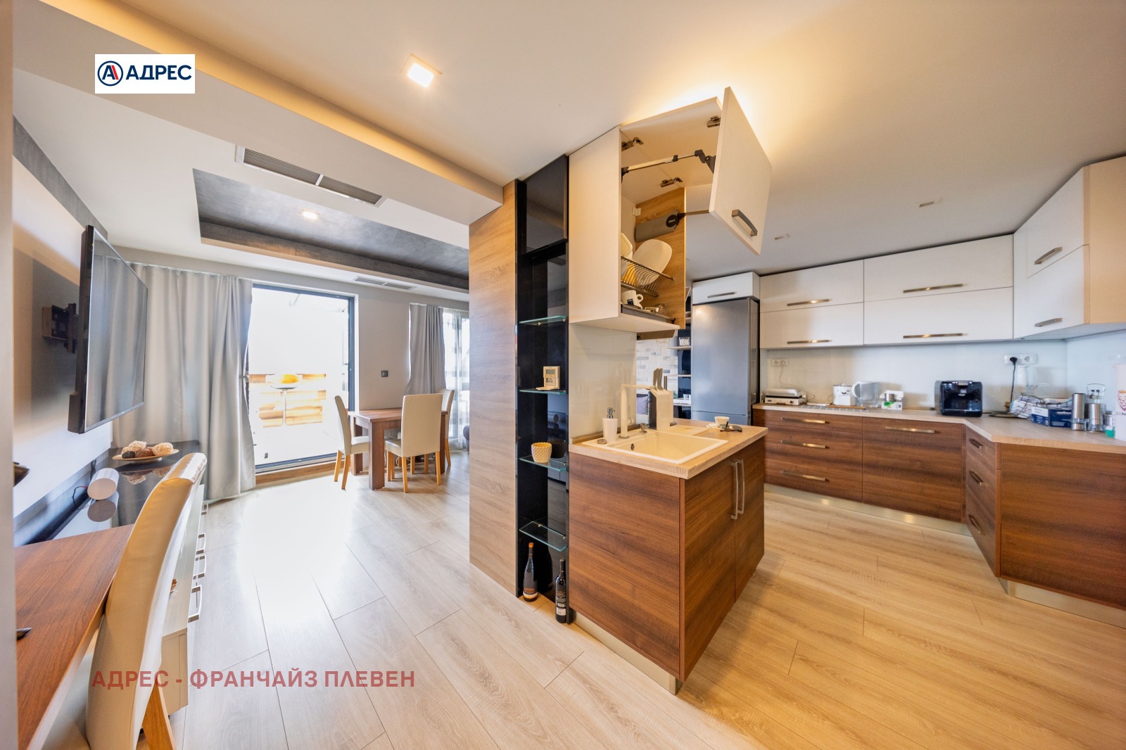 'Адрес'- Плевен предлагаме стилен и функционално разпределен апартамент, разположен в централната част на града, съчетаващ удобството на градския живот с комфорт и модерно пространство. Жилището разполага с две просторни и светли спални, осигуряващи спокойствие и уют. Основното пространство е голяма всекидневна с кухня и елегантен кухненски остров, проектирана в модерен отворен стил. Тази зона създава идеална атмосфера както за ежедневието, така и за посрещане на гости. Апартаментът включва баня с тоалетна, отделна самостоятелна тоалетна, както и просторен дрешник с обособено перално помещение, което осигурява допълнителна практичност и удобство. Към имота има голяма тераса с приятна гледка, подходяща за отдих, сутрешно кафе или спокойни вечери на открито. Имотът се намира тип център, в близост до основни градски удобства магазини, заведения, институции и транспорт, което го прави отличен избор както за живеене, така и за инвестиция.