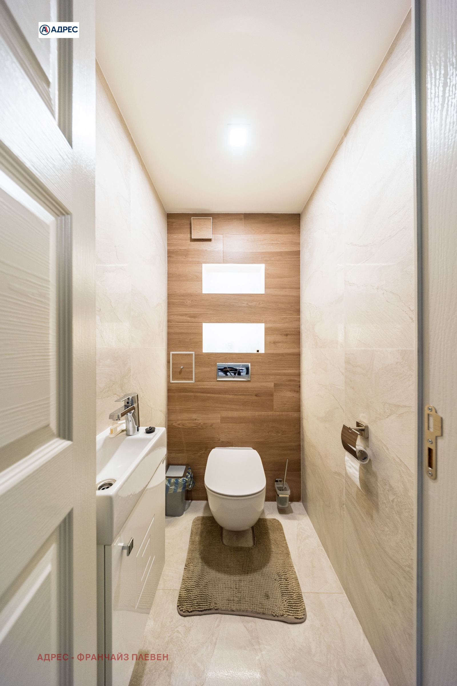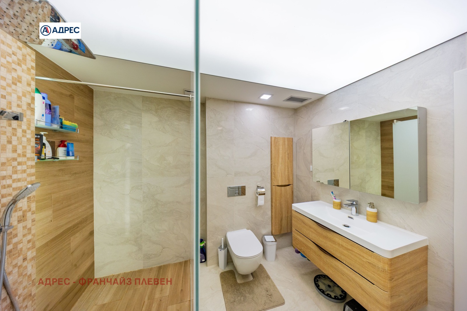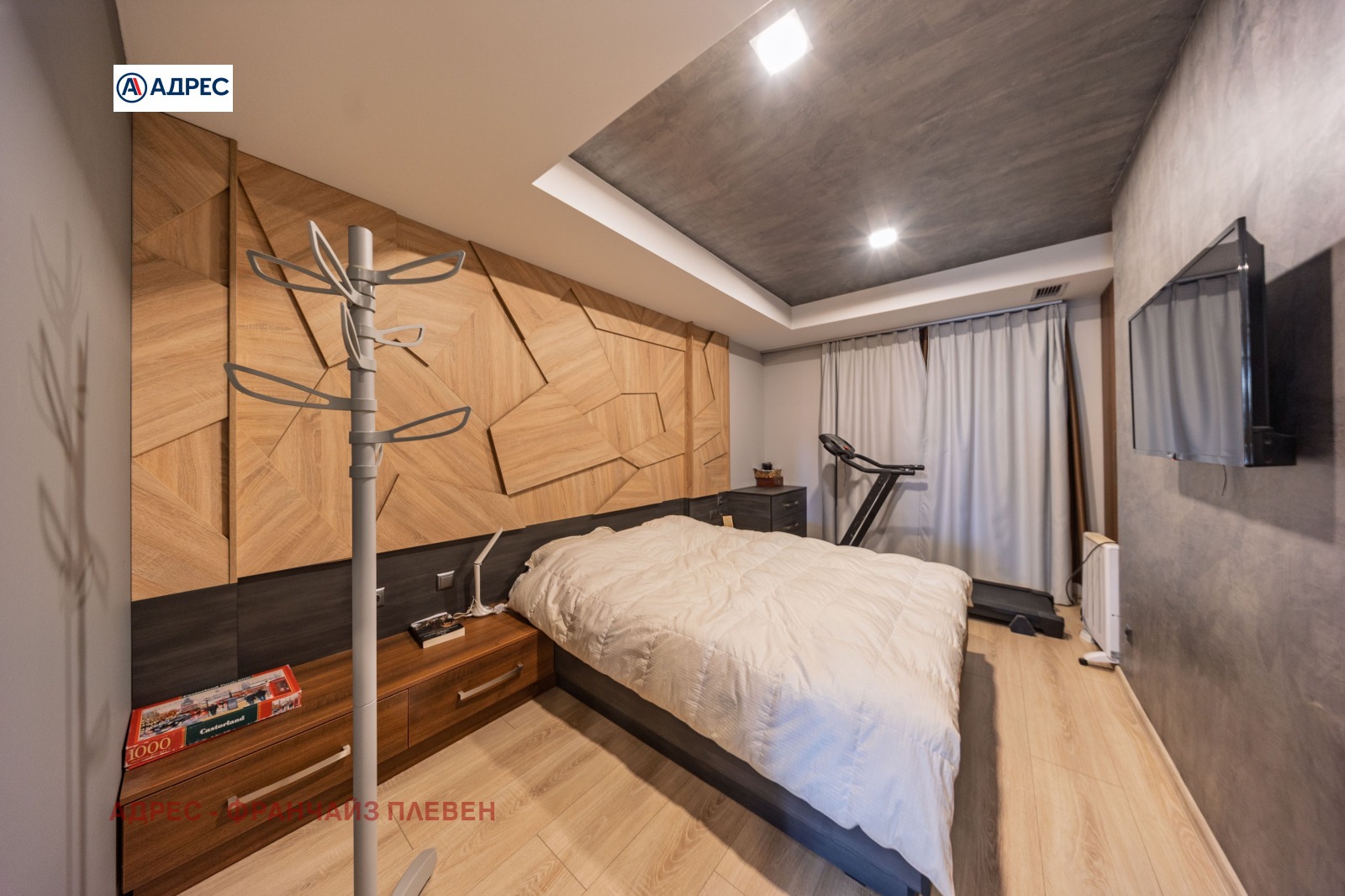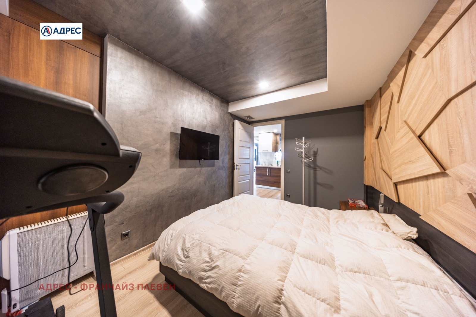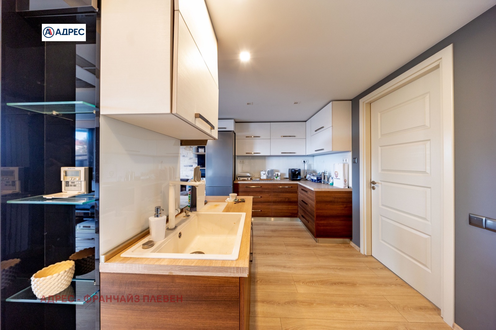 'Адрес'- Плевен предлагаме стилен и функционално разпределен апартамент, разположен в централната част на града, съчетаващ удобството на градския живот с комфорт и модерно пространство. Жилището разполага с две просторни и светли спални, осигуряващи спокойствие и уют. Основното пространство е голяма всекидневна с кухня и елегантен кухненски остров, проектирана в модерен отворен стил. Тази зона създава идеална атмосфера както за ежедневието, така и за посрещане на гости. Апартаментът включва баня с тоалетна, отделна самостоятелна тоалетна, както и просторен дрешник с обособено перално помещение, което осигурява допълнителна практичност и удобство. Към имота има голяма тераса с приятна гледка, подходяща за отдих, сутрешно кафе или спокойни вечери на открито. Имотът се намира тип център, в близост до основни градски удобства магазини, заведения, институции и транспорт, което го прави отличен избор както за живеене, така и за инвестиция.