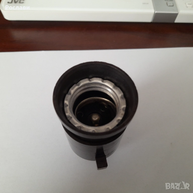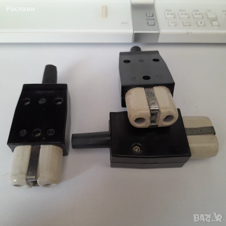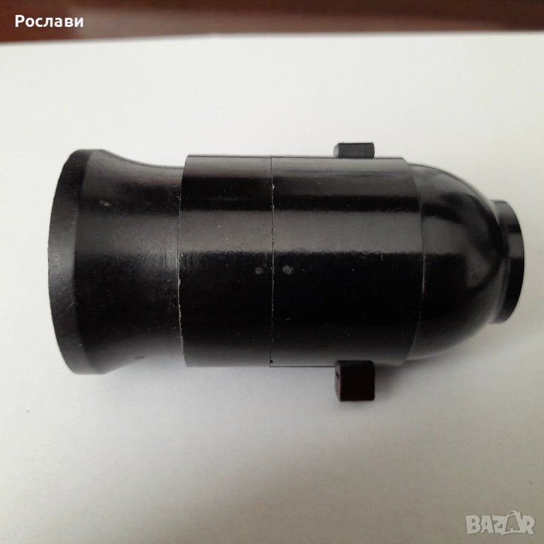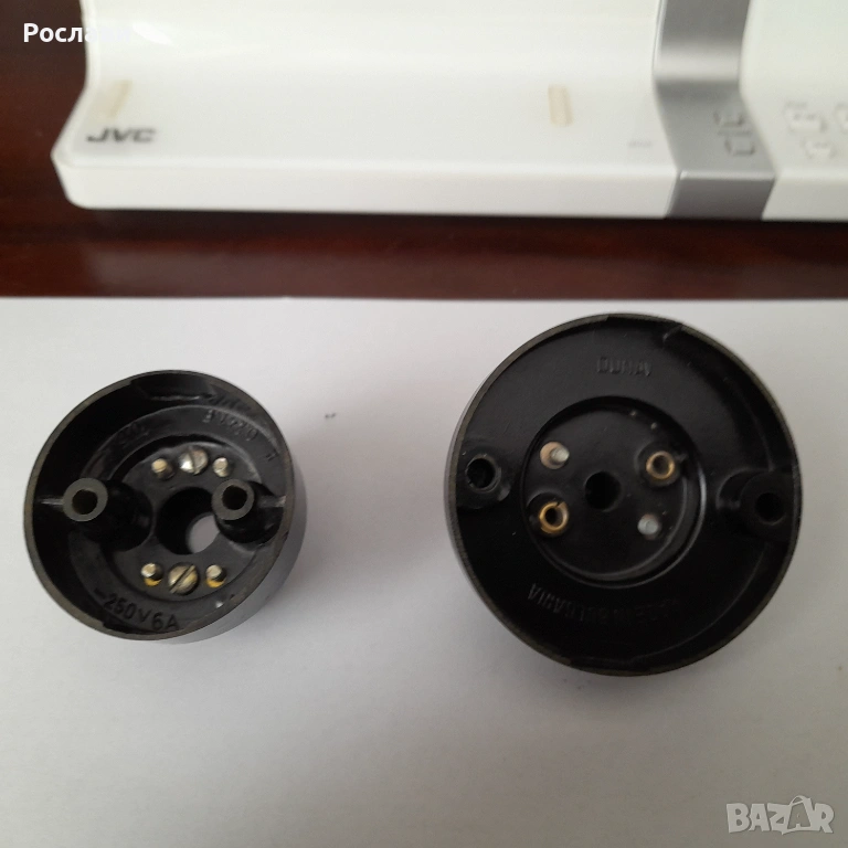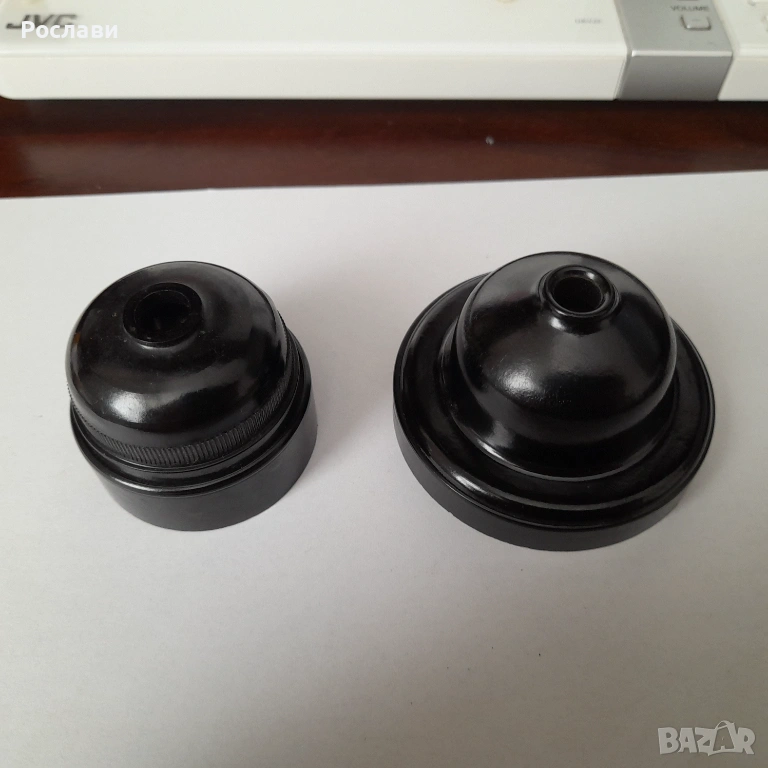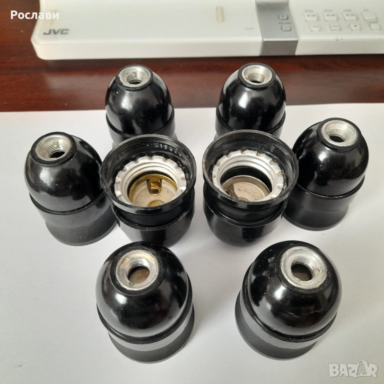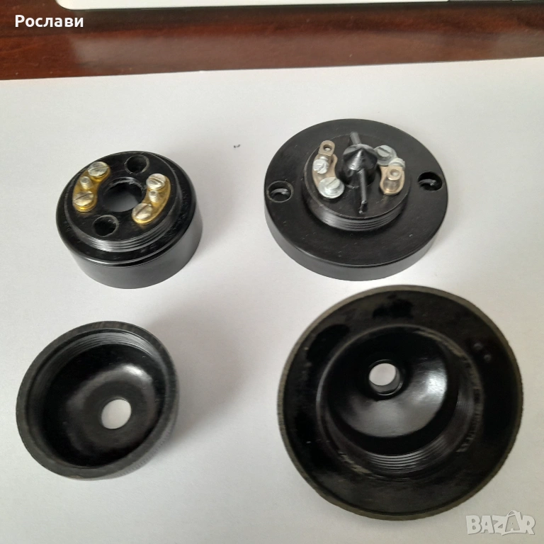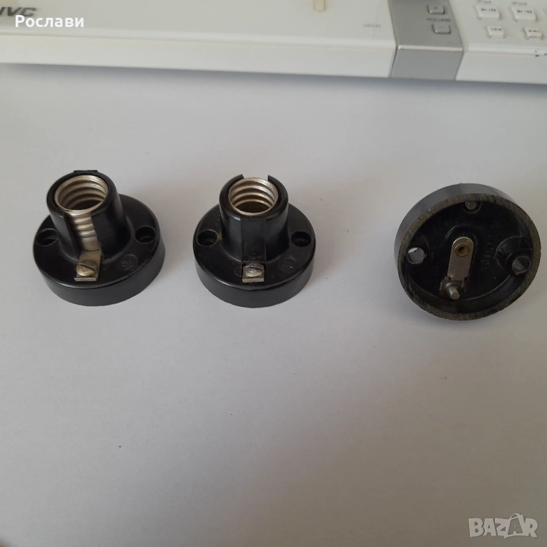3. Елемент за захващане с опроводяване на висяща крушка от таван. Елемента е от 2 части - едната се захваща за тавана и през отвор в нея минава проводника от тавана. На нея има пластини две свинтчета за електрическа връзка към кабела на висящата лампа, с което се усигурява и механичното укрепване на лампата. Втората част е с чисто декоративно предназначение за да се скрие свързването. Предложени са два вида на такива еламенти по три броя. Това се използваше в миналото, когато имаше обикновено една крушка завита на висящ от тавана кабел с фасунга и нямаше толкоз модерни осветителни тела за таван - снимки 5, 6 и 7, по три броя от двата вида.