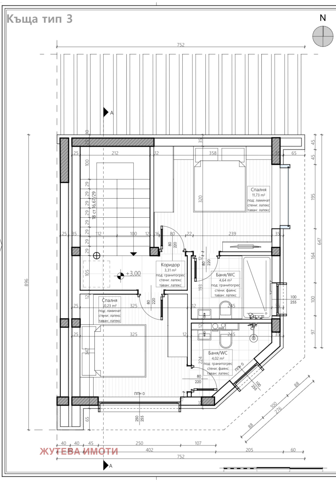 Общата застроена площ е 104,86 кв.м., разпределени на два етажа по 52,43 кв.м.