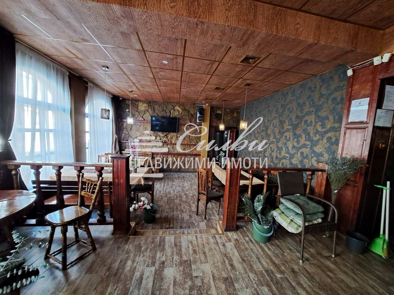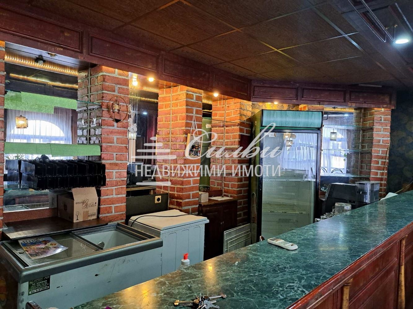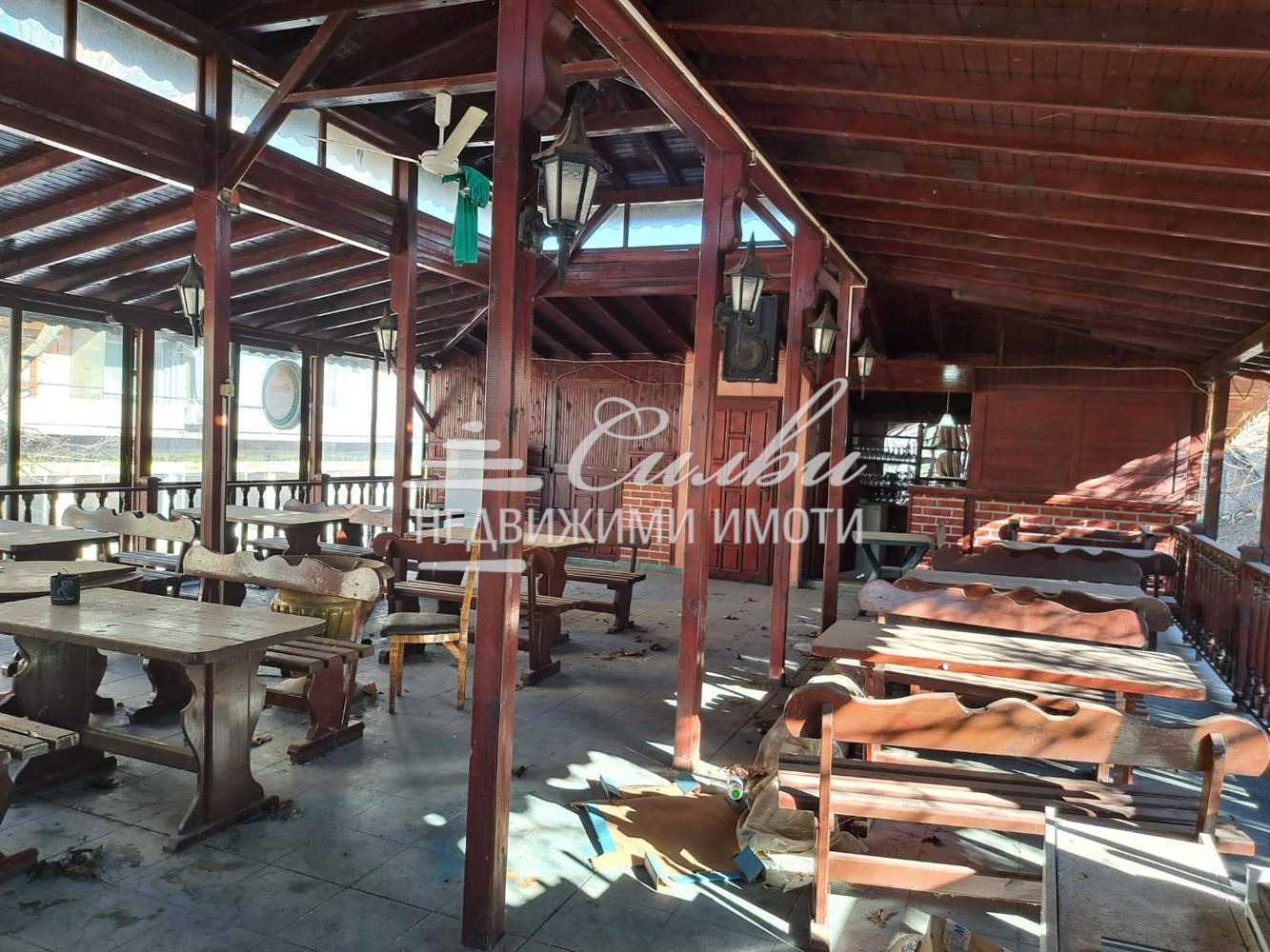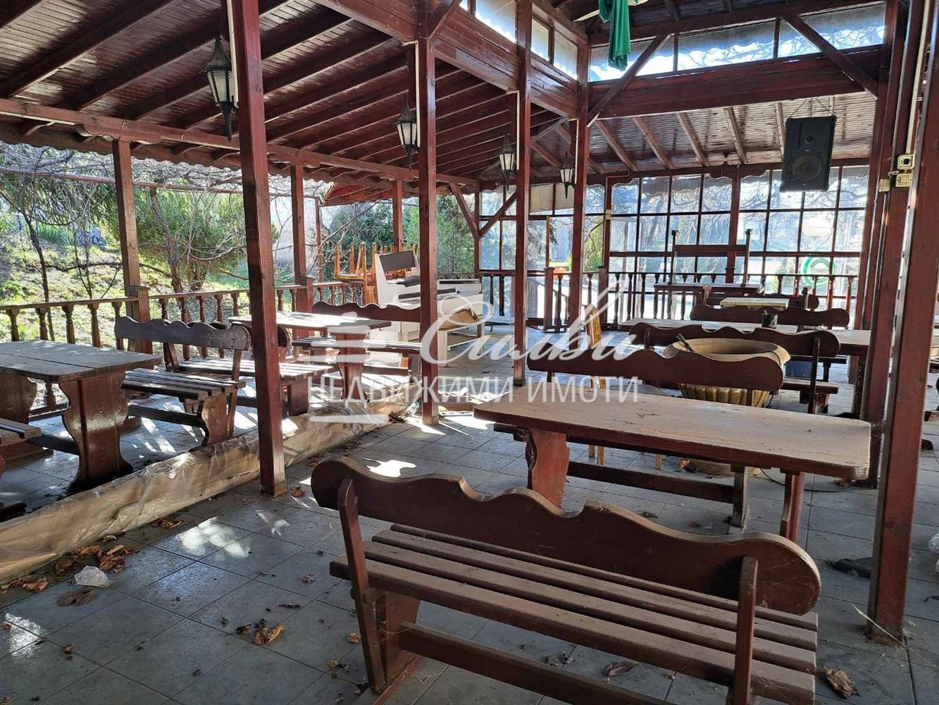 Имотът е САМОСТОЯТЕЛНА сграда с площ от 112 кв.м. търговска част, 140 кв.м. покрита тераса, склад 8 кв.м. Разделен е на две самостоятелни помещения с отделни входове. Всяко помещение разполага със самостоятелни бар, кухня и санитарно помещение. Подобрения: подовата настилка е гранитогрес. Отоплението е решено посредством КЛИМАТИК и локално ПАРНО на твърдо гориво. Заведението разполага със соларна система за топла вода. Предлага се напълно ОБОРУДВАНО и ОБЗАВЕДЕНО, като разполага с: пещ за пици, хладилни витрини, готв. печки, скара, телевизор, маси, столове и др.