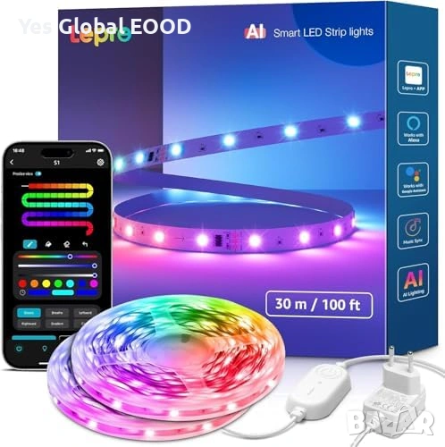 Интелигентна Lepro S1 AI LED лента 30 метра с MagicColor RGB ефекти и WiFi управление. Поддържа гласов контрол чрез Alexa и Google Assistant, което позволява лесно управление на осветлението чрез гласови команди.