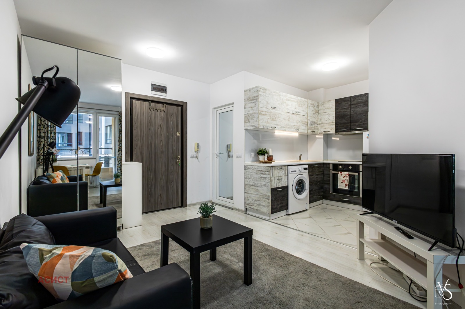 Апартаментът се състои от хол с кухненски бокс и спалня, баня с тоалетна и балкон.