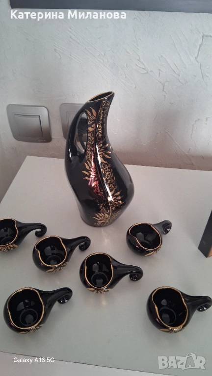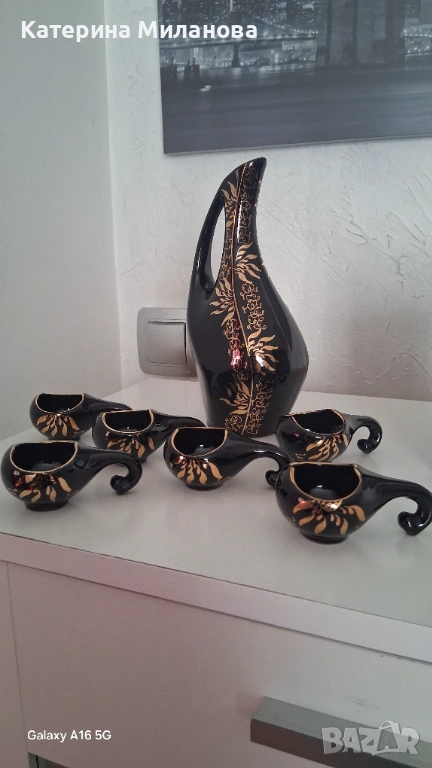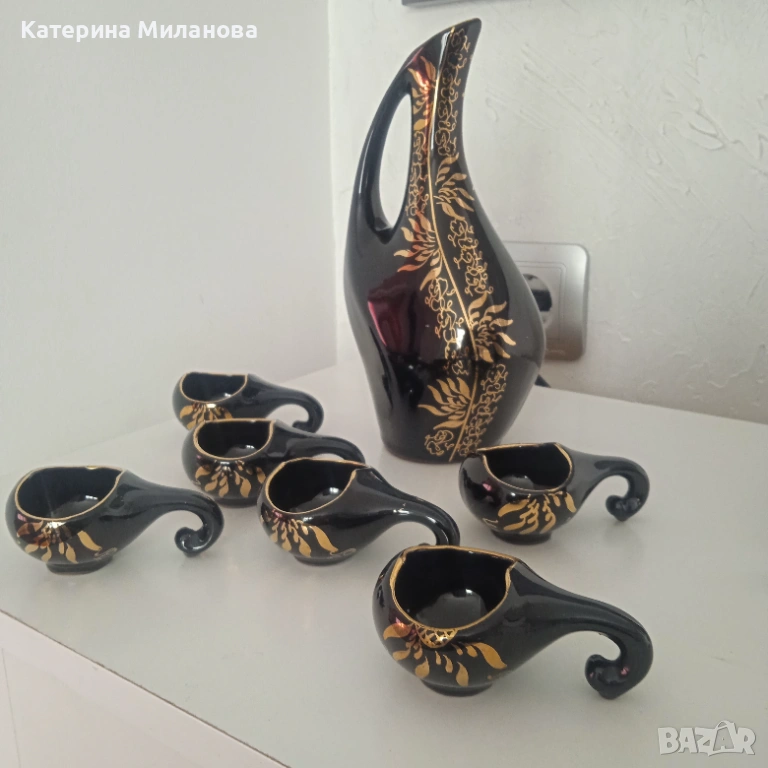 Сервиз за греяна ракия, украсен със златни орнаменти. Бърдуче и 6 бр. кратунки, здрави, без забележки!