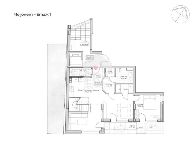 Ниво 1: Входно антре, дневна с кухненски кът и трапезария 43.23, баня с тоалетна, тоалетна за гости, склад, мокро помещение, спалня и тераса.