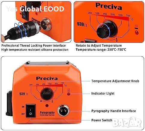 Пирографска станция Preciva, предназначена за гравиране и декорация върху дърво, кожа и корк. Комплектът включва пирограф с регулируема температура от 250℃ до 750℃ и 20 различни накрайника за създаване на различни линии, форми и декоративни ефекти.