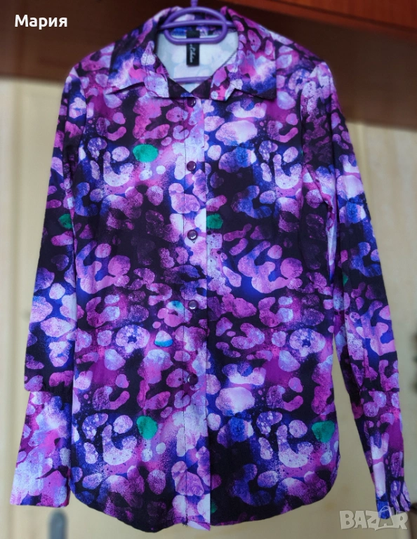 Многоцветна риза с елегантен дизайн и широк маншет с копчета около китките. Не е носена.