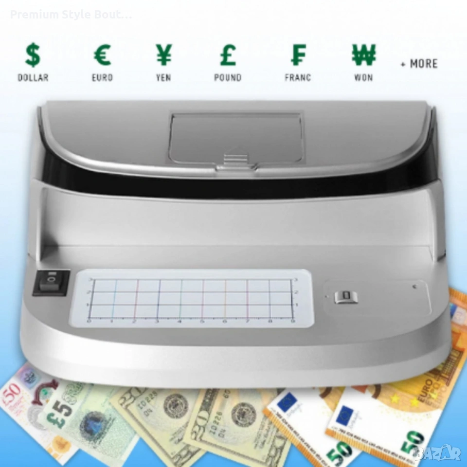 Материал / корпус: ABS Размери: широчина 155 мм, дълбочина 137 мм, височина 82 мм Нетно тегло: около 504 г Бруто тегло: 0.7 кг Метод на откриване: UV LED светлина, флуоресцентна светлина, магнитен сензор, вградена лупа Захранване: 12V / 1A (AC адаптер) Захранващо напрежение: 100–240V, 50/60Hz Консумирана мощност: