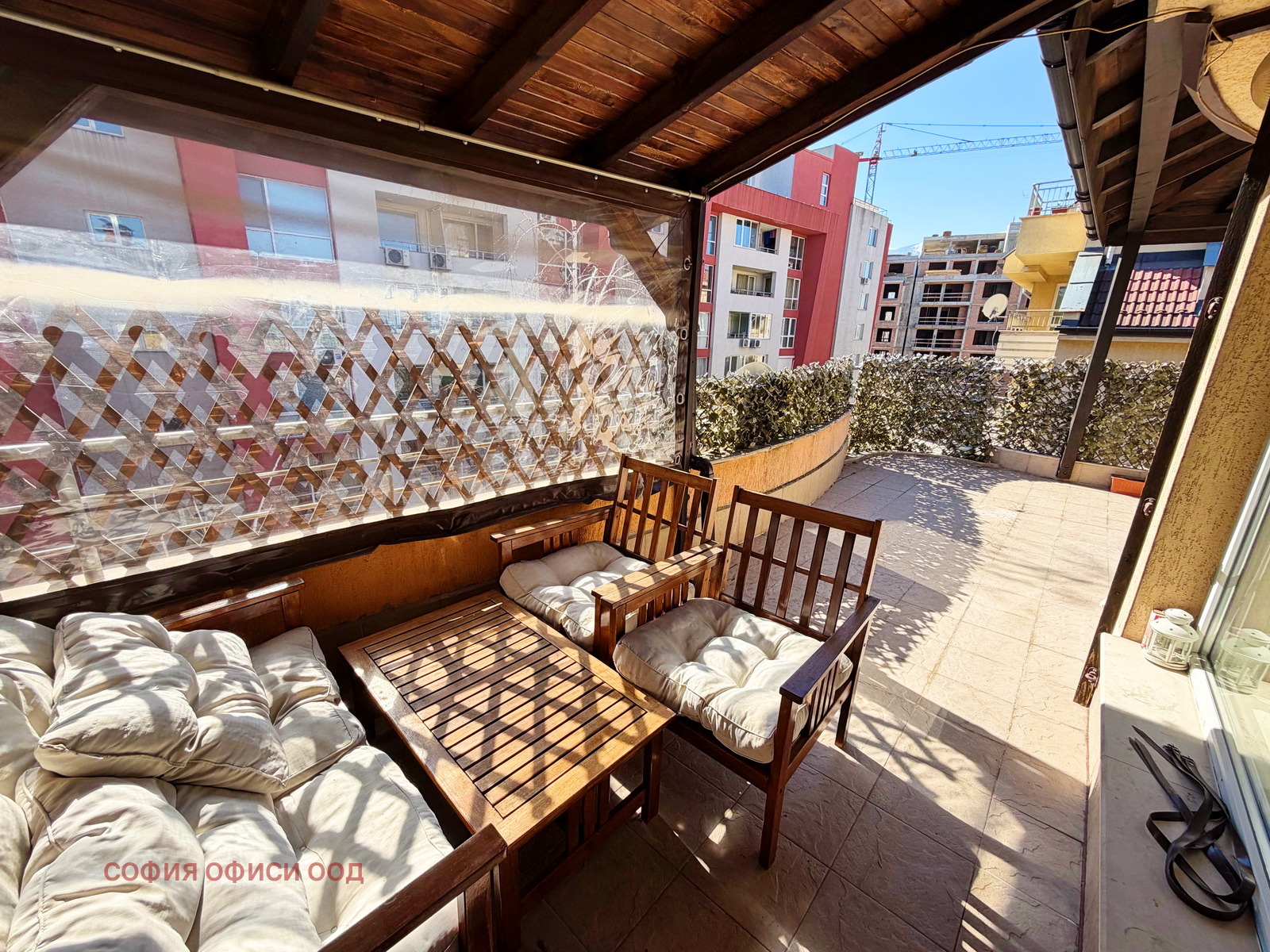 Имотът е с просторно и следното практично разпределение: голям южен хол с трапезария, напълно оборудвана кухня, родителска спалня, Две детски стаи / кабинет, баня с вана, отделна тоалетна и просторна тераса с навес, достъпна от дневната идеална за сутрешно кафе или вечерна почивка.