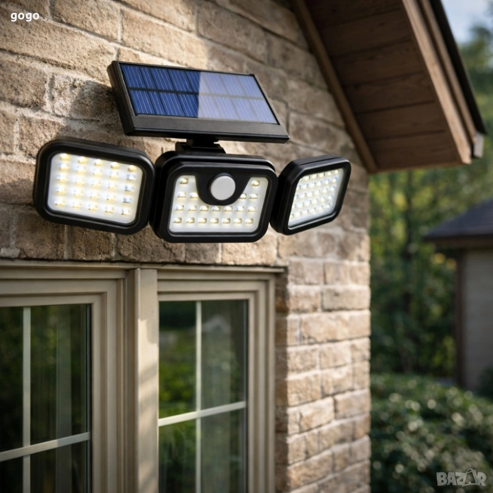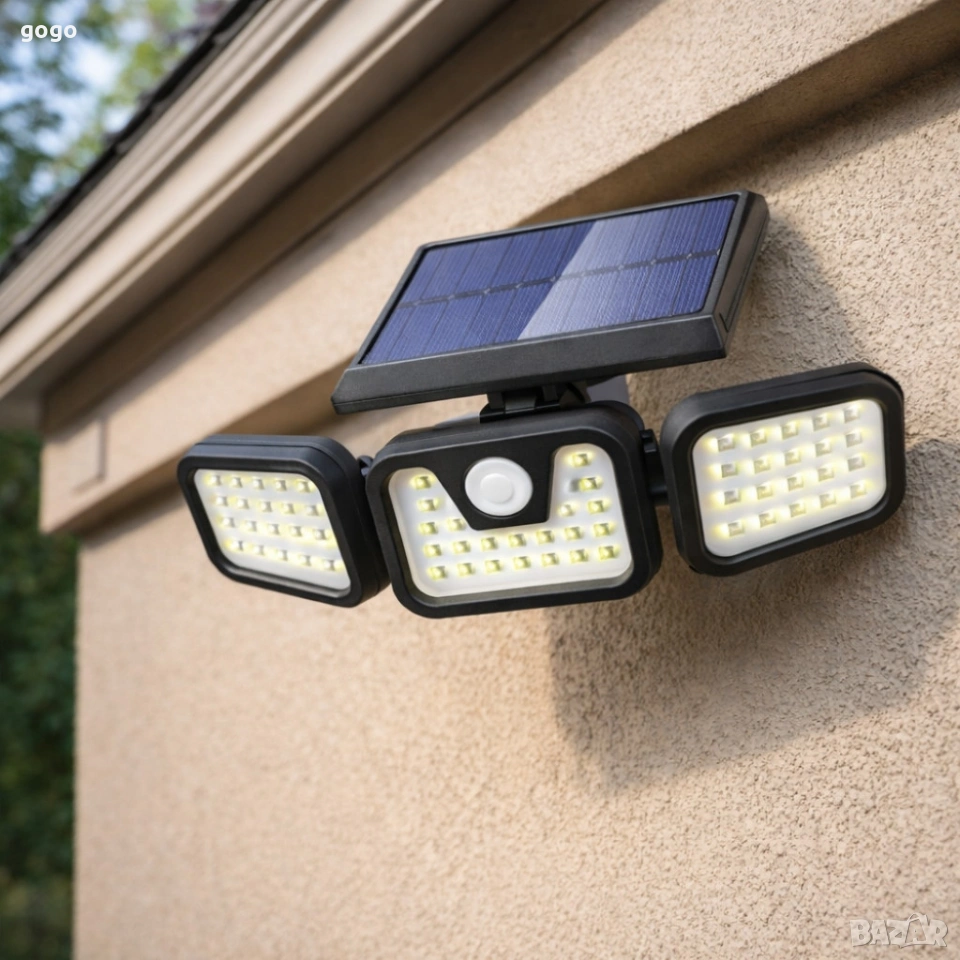 Соларна лампа със сензор за движение FL1725A - широкоъгълна и водоустойчива Техническите спецификации дават ясна представа за възможностите: Светлинен поток: до 800 лумена Цветна температура: 6500K (дневна светлина), някои описания посочват 3000K за топла светлина Брой LED: 74 Соларен панел: 5.5V / 2.8W, поликристален Батерия: 3.7V 2400mAh литиева (акумулаторна) Време за зареждане: 5–7 часа пряка слънчева светлина Работно време: 6–9 часа в зависимост от режима Защита: IP65 (водоустойчива) Размери: 30 x 18 x 13 см; Тегло: 940 г Монтаж: стенен, без окабеляване; бутонен контрол за превключване на режимите доставка с Еконт с опция преглед и тест до 3 работни дни.