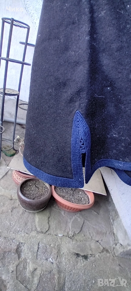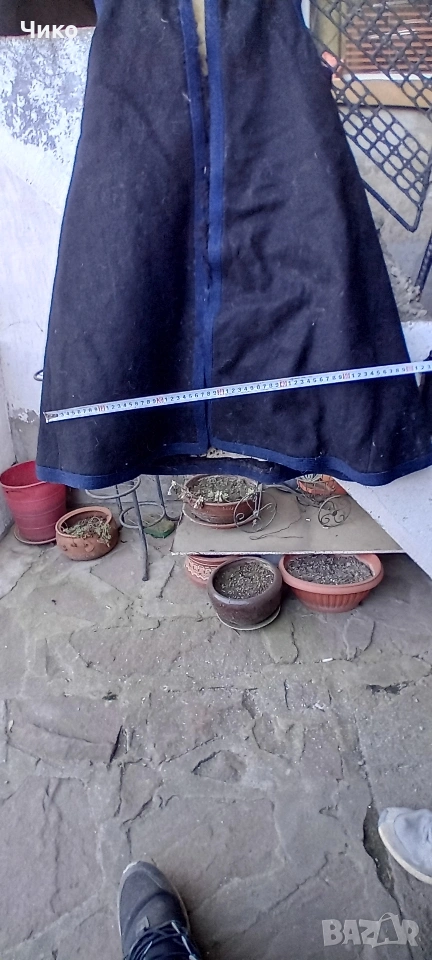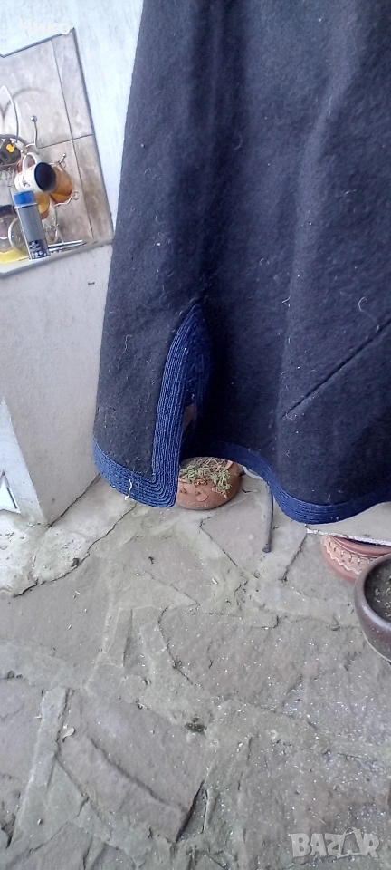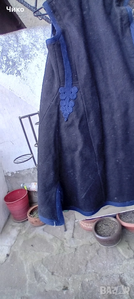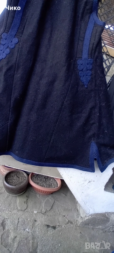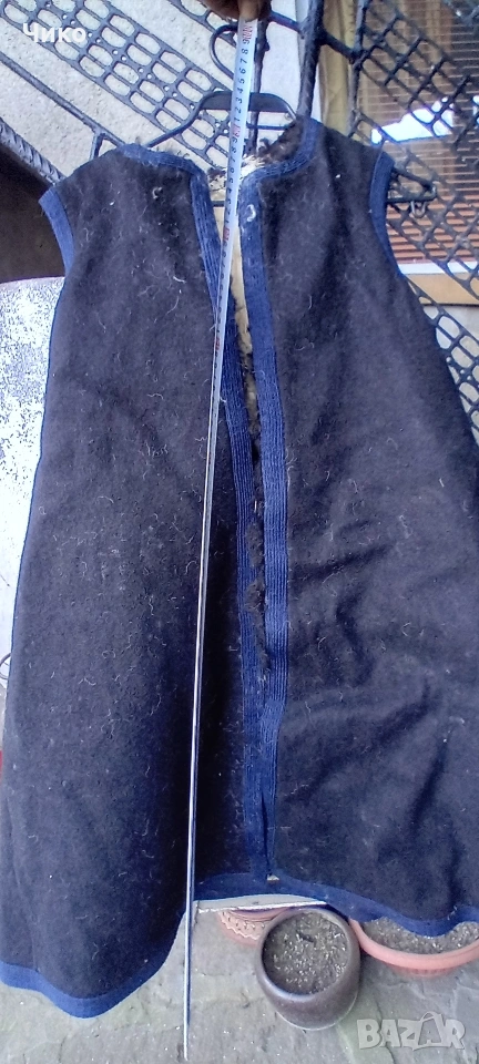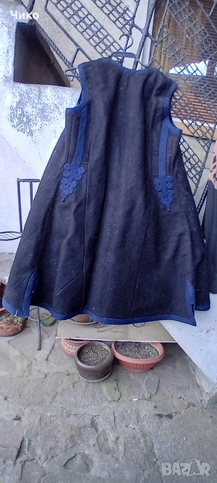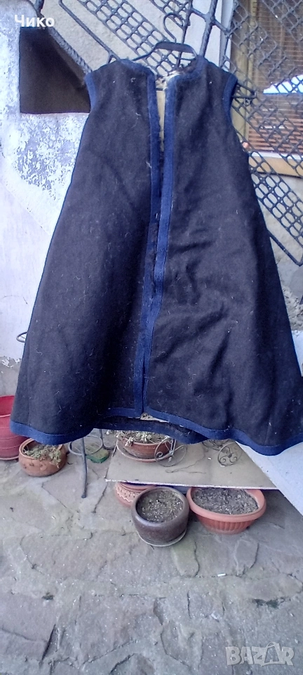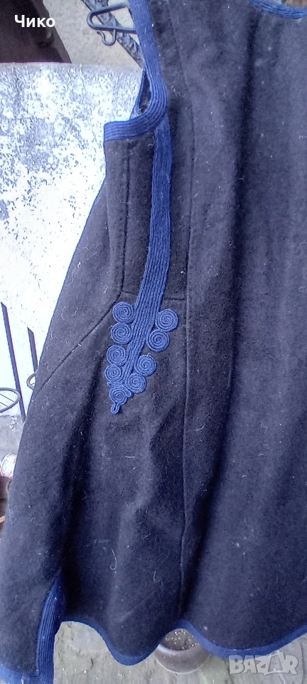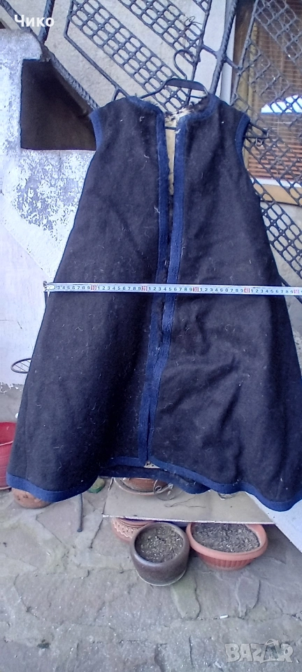 Стар вълнен дълъг женски елек от черен шаяк със красиви гайтани и кожена подплата..чорбаджийска носия!размерите са снимани само за колекционери и ценители цената е символична!