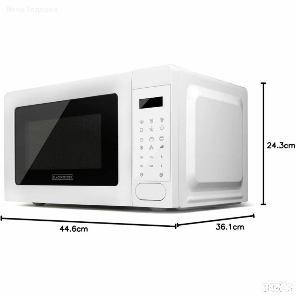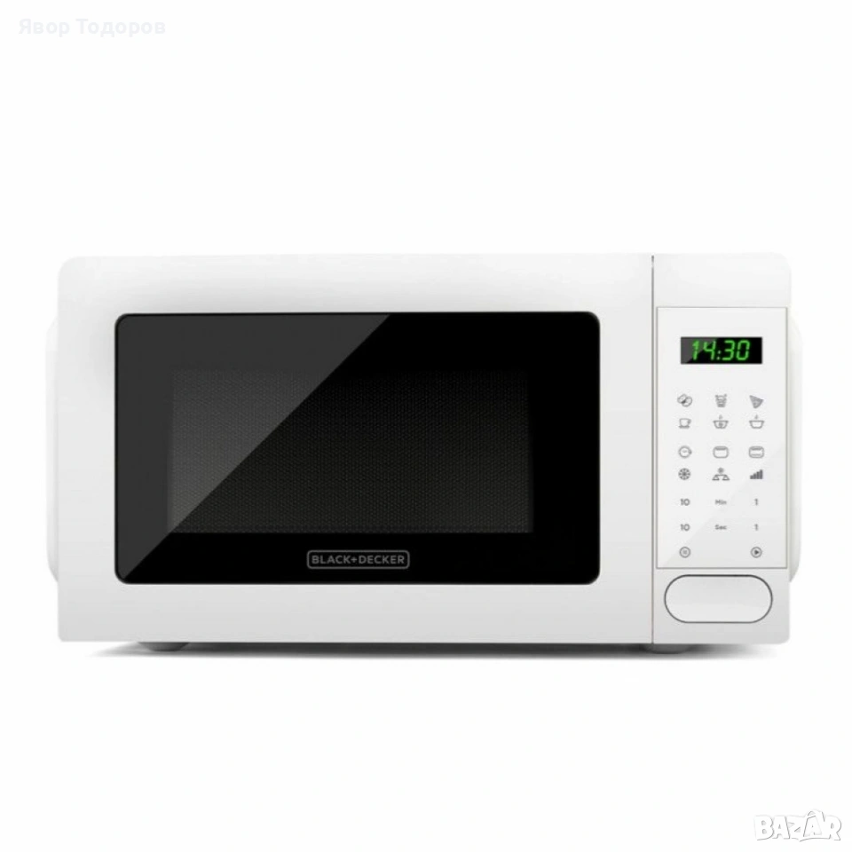 Продукт: Микровълнова с грил Black+Decker BXMZ701E; Капацитет: 20 L; Мощност: 700 W; Нива на мощност: 5; Функции: микровълнова, грил, комбинирани режими; Автоматични програми: Да; Таймер: до 95 минути със звуково предупреждение; Въртяща се чиния: Ø 245 мм; LED вътрешно осветление: Да; Управление: дигитално + бутони; Дисплей: с часовник и таймер; Размери: 455 × 360 × 259 мм (прибл.); Цвят: Бял.