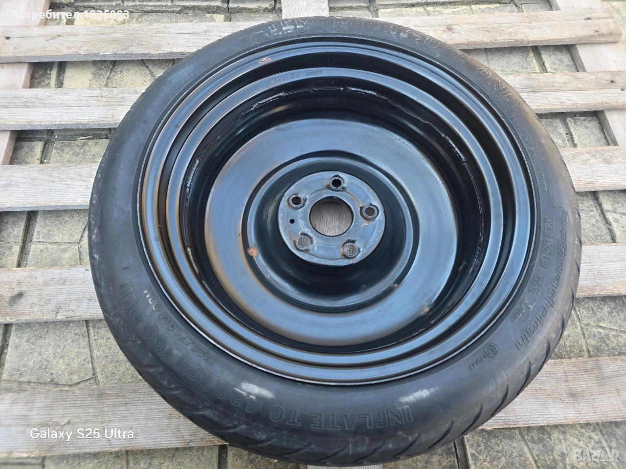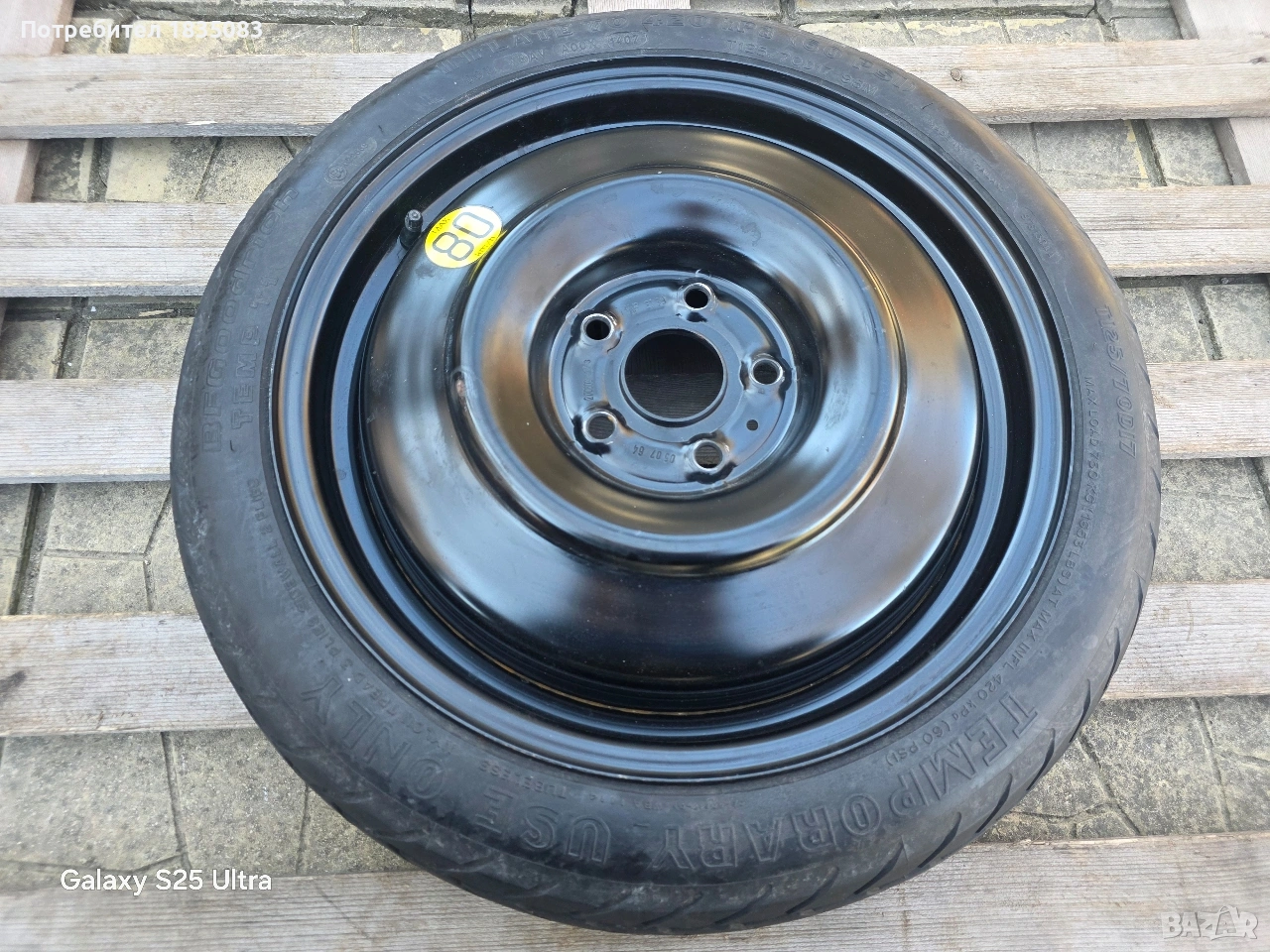 Продавам оригинална резервна гума тип патерица за Тойота и др. с размери 17" 5х114.3 4J ET39 ЦО60.1мм. с гума BF Goodrich 125/70/17.