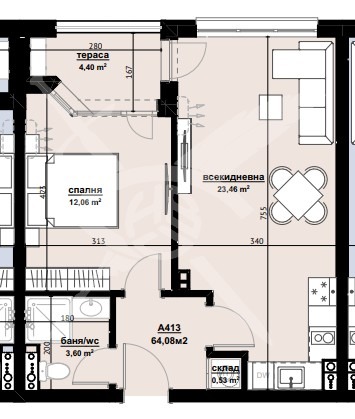 РАЗПРЕДЕЛЕНИЕ: Жилището разполага с площ 64,08 кв.м., състои се от хол с кухня, спалня и баня с тоалетна.