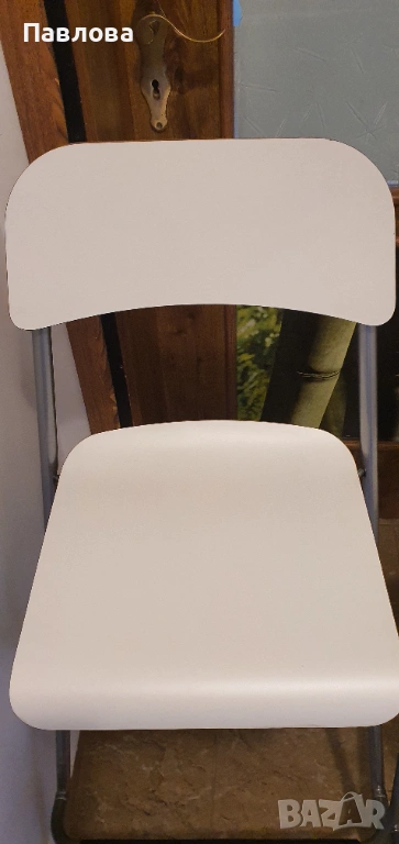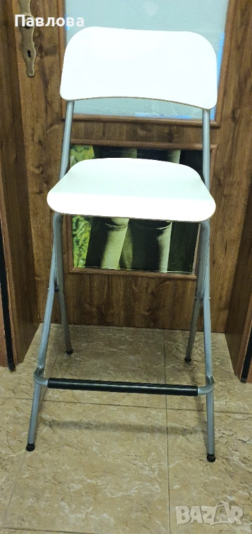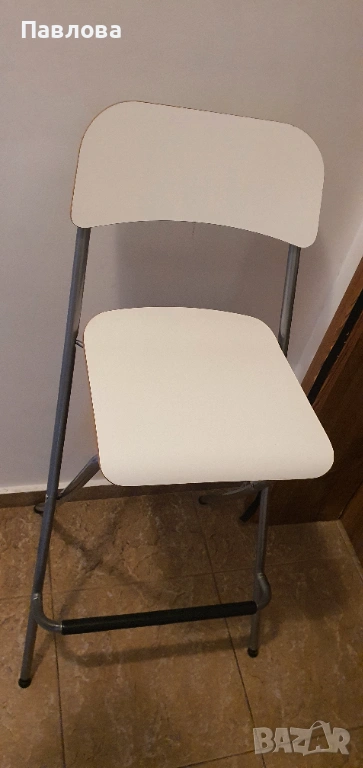 Продавам 6 бр. сгъваеми бар стола FRANKLIN. Единият от столовете е по-нисък и има лека забележка. Цена 25 Евро за 1 бр., за по-ниският - 20 Евро. Възможно лично предаване за гр. Пловдив. Столовете са използвани в офис трапезария и са в отлично състояние.