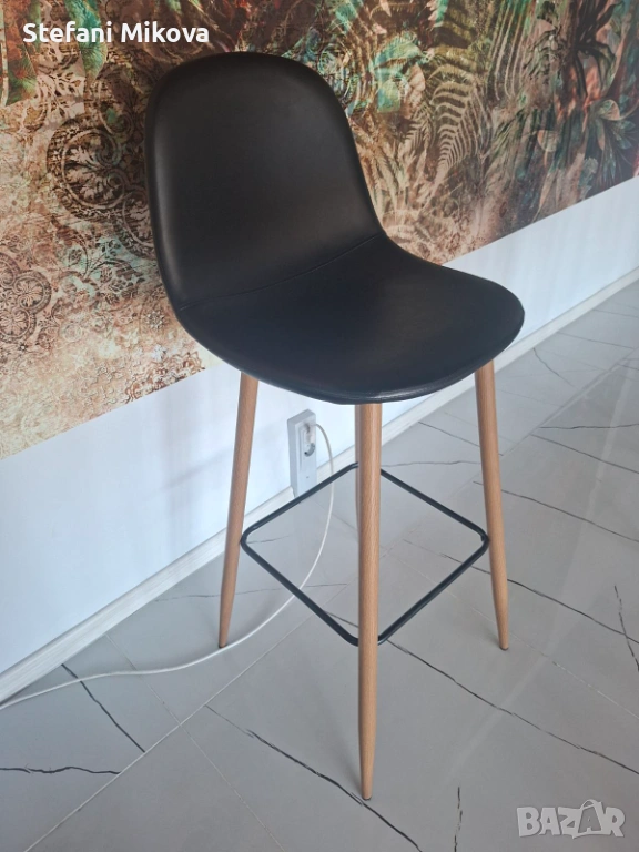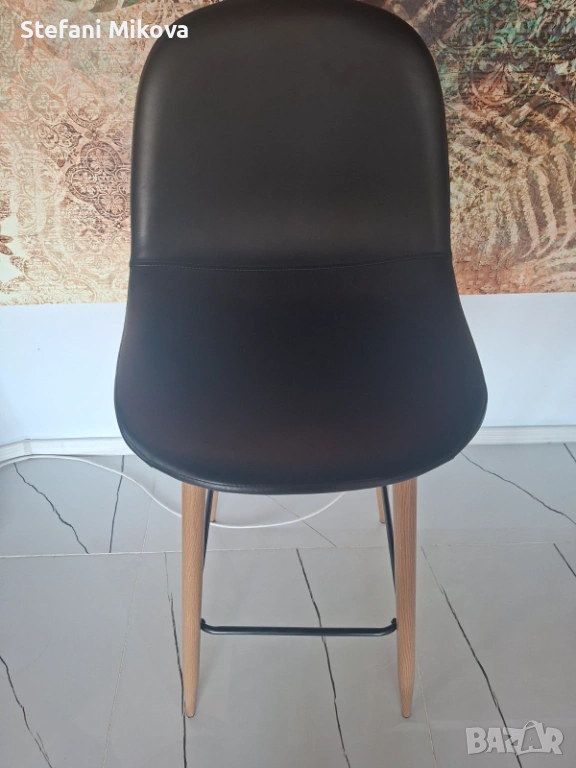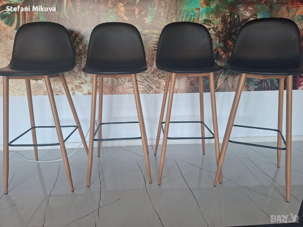 Удобни и стилни бар столпве с черна изкуствена кожа и дървени крака. Подходящи за кухня, бар или домашен интериор.