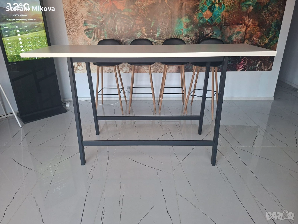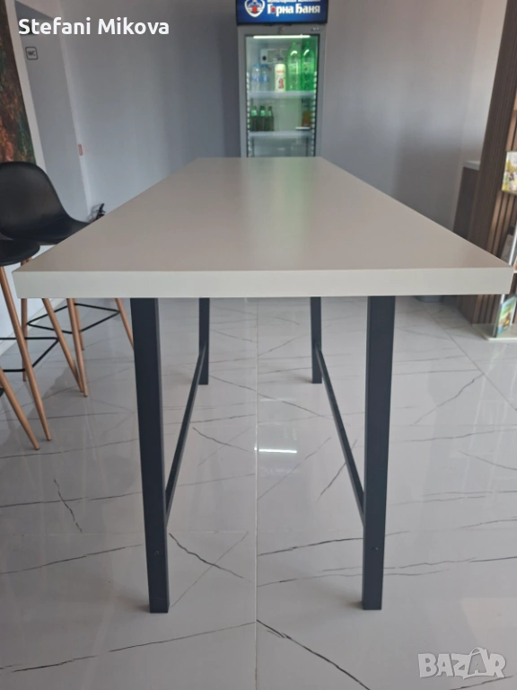 Запазена конферентна маса по поръчка. Масата има голям размер и е подходяща за работни срещи или домашна употреба. Основата е изработена от метал, а плотът е в бял цвят.