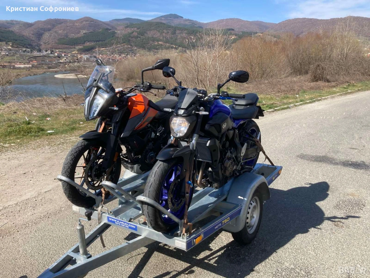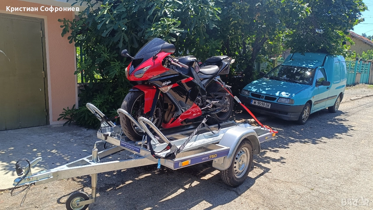 Отдавам под наем чисто ново ремарке Vesta Moto 750 — едно от най-практичните и удобни на пазара в момента. Ремаркето е с капацитет до 2 големи мотора или до 3 кросови, оборудвано с удобна рампа за товарене, здрави укрепващи места и изрядни документи. Цени: 15 евро на ден — за 1 ден. 13 евро на ден — при наем от 2 до 10 дни. Допълнителни услуги: Доставка до адрес в рамките на град София— 10 евро. (еднократна такса) Вземане от адрес в рамките на град София — 10 евро. (еднократна такса) Колани за укрепване — 3 евро. (за целия период на наема) Преходна букса за светлините (при необходимост) — безплатно Депозит: При резервация на дати се изисква минимално капаро както и депозит от 50 евро когато вземете ремаркето, който се възстановява при връщане на ремаркето в изправно състояние и без щети. Изискване: За шофиране с ремаркето е необходима шофьорска книжка категория B. Ремаркето е в отлично техническо състояние и готово за път. Може да се възползвате и от надежден и професионален транспорт за своето атв и/или мотор/и в рамките на гр. София или страната Цени : За град София - от 30 евро. За страната - по договаряне. За повече информация и резервации — обадете се или пишете. Понякога не мога да отговоря по телефона през деня затова не се притеснявайте да ми пишете и при първа възможност ще върна обаждане.