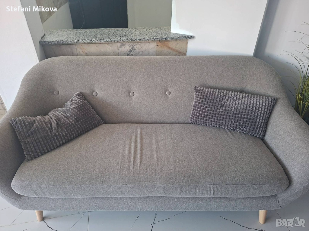 Уютен и практичен диван с 2,5 места за сядане. Изработен от качествен текстил в сив цвят, с декоративни възглавници. Подходящ за всекидневна или офис. Диванът е в отлично състояни, без следи от използване.