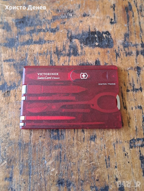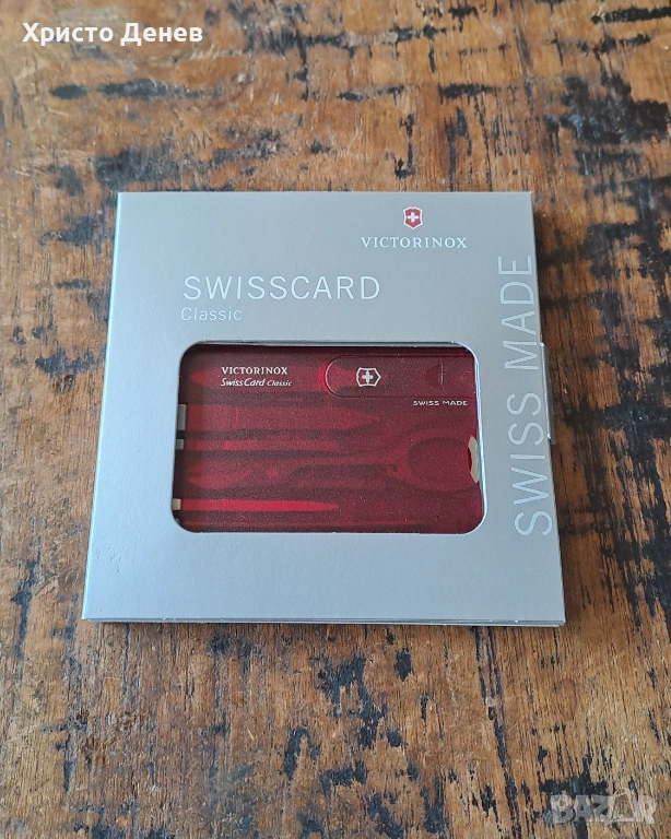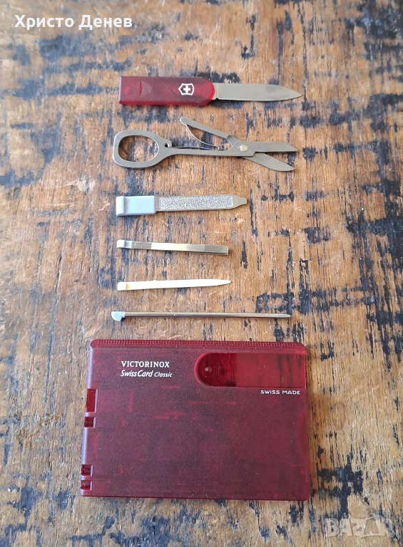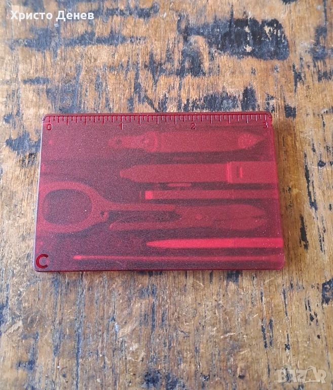 козметичен комплект 10 инструмента швейцарски с нож за писма червен. Произведен в Швейцария. Комплектът включва: нож за писма, ножица, карфица от неръждаема стомана, пила за нокти с отвертка 3 мм с плосък връх, химикалка, пинсета, клечка за зъби, линийка в см и линийка в инчове. Размер на червената карта : 8,2x5,5 см. Картонената кутия е с размери: 12x12x0,8 см. Страхотен подарък. За ценители.