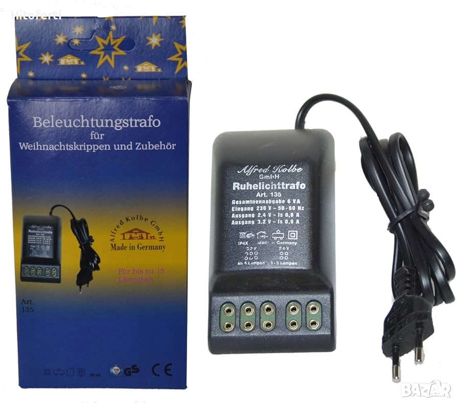 Трансформатор за покой и мигаща светлина на Alfred Kolbe 230 волта / 3,5 волта. 2 връзки за мигаща светлина, 3 връзки за тиха светлина. За вертепи и аксесоари.